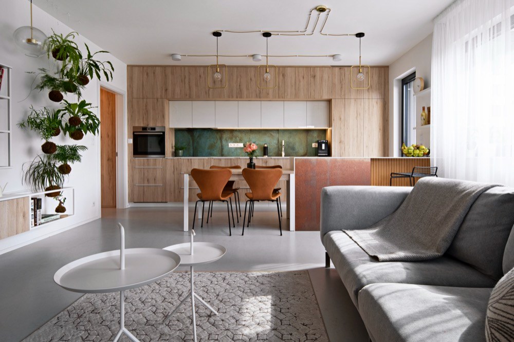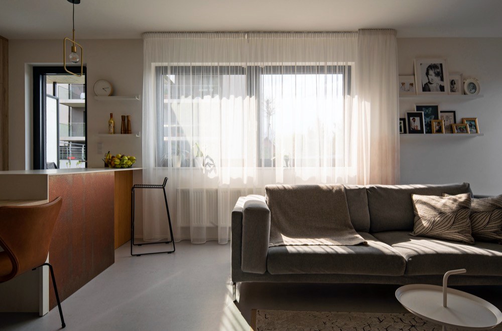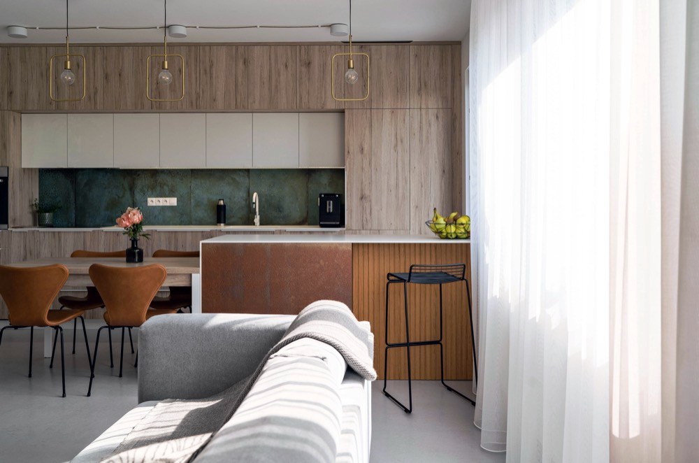 „K projektu jsme se dostali ve chvíli, kdy developer uzavíral výběr podlah a dveří,“ říká designérka Lenka Juklíčková. „To byla poslední věc, kterou se nám podařilo protlačit. Navrhli jsme bílé dveře a klientka kývla na neutrální šedé marmoleum na podlaze, abychom si o to víc mohli hrát s interiérem a všemi materiály.“ Na neutrálním základě vynikají barvy a struktury interiérových prvků. Světlé tóny opticky zvětšují společenský prostor, jemuž dominuje kuchyňská linka s výrazným obkladem doplněná o rafinované vnitřní osvětlení a měděné prvky na baru a obývací stěně.