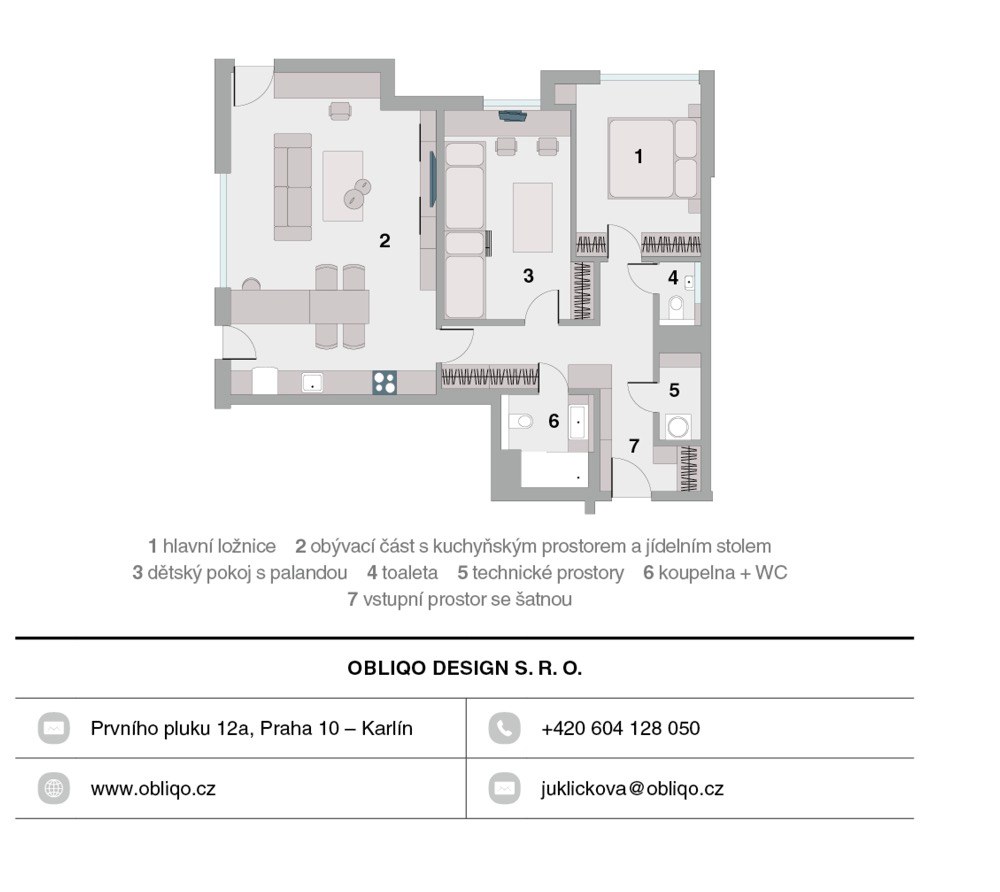 Do projektu vstoupilo studio Obliqo ke konci uzavírání klientských změn. Bylo nutné v krátkém čase vyřešit funkční uspořádání a maximalizovat úložné prostory, aby vzniklo pohodlné a útulné bydlení. Studiu Obliqo se podařilo do interiéru beze zbytku propsat osobnost jeho majitelů. „Mám velkou radost, když z interiéru cítím ducha konkrétní osobnosti,“ usmívá se Lenka Juklíčková, zakladatelka studia Obliqo. „Majitelka je sofistikovaná elegantní dáma s citem pro estetiku. A interiér nese její charakteristiky,“ dodává. Na výsledku je znát prostá souhra majitelů a designérů, vzájemné pochopení, cit a respekt.