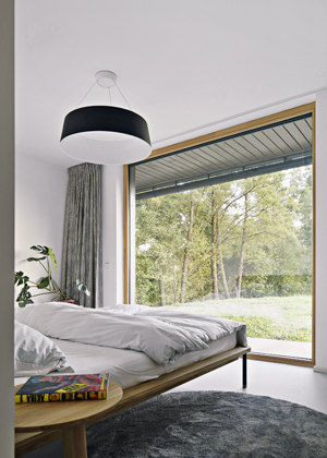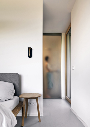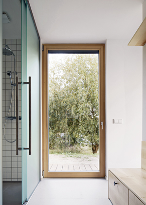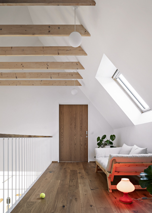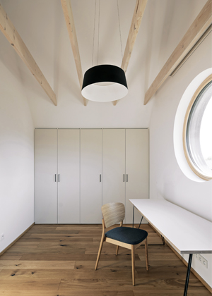 Vzhledem k relativní kompaktnosti stavby usilovali architekti o vytvoření maximálního dojmu prostoru i vzdušnosti, čehož dosáhli částečným otevřením centrálního prostoru obývacího pokoje až do hambalkového krovu nebo oddělením prostoru zádveří skleněnou stěnou s textilním závěsem. Zbytek přízemí věnovali ložnici s en suite koupelnou a průchodu atypickým nábytkem s velkým úložným prostorem. Kladli přitom důraz na to, aby vstup do domu nebyl „zazděn“ žádnými zbytečnými příčkami chodeb a technických místností. V patře pak našly své místo zbývající dvě ložnice se samostatnou koupelnou a galerie variabilně využitelná k odpočinku nebo k dětským hrám.
