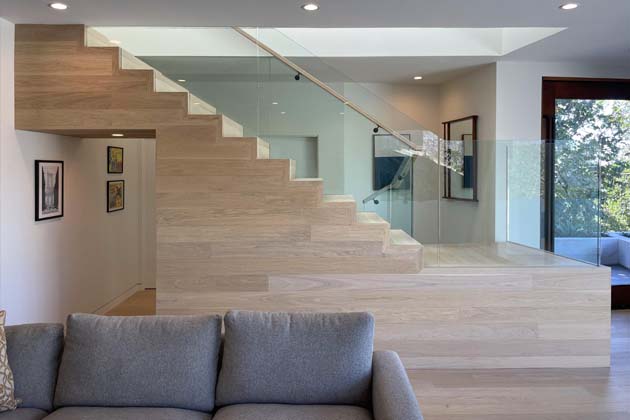 To nejzajímavější se však odehrává přímo nad hlavou. Lineární světlík, který protíná dům jako svítící páteř, přivádí přirozené světlo i do těch nejhlubších koutů. Slunce se zde stává stavebním materiálem – dům díky tomu nepotřebuje umělé osvětlení až do pozdního odpoledne. Tento „světelný tunel“ navíc vytváří dokonalou vizuální osu: jakmile vstoupíte, vidíte skrze celou hloubku domu až k zadní skále, což prostoru dodává nečekanou velkorysost