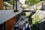 Zadní část domu se otevírá do privátní terasy, která působí jako tajný venkovní pokoj vytesaný přímo do svahu. Tento intimní prostor, chráněný okolní krajinou, tvoří protiváhu k otevřené čelní fasádě. Právě zde se odehrává jeden z nejzajímavějších momentů stavby – elegantní most, který vybíhá z druhého patra a fyzicky spojuje architekturu s horní částí pozemku. Obyvatelé tak mohou plynule přecházet z ložnice rovnou do divoké zeleně v kopci.