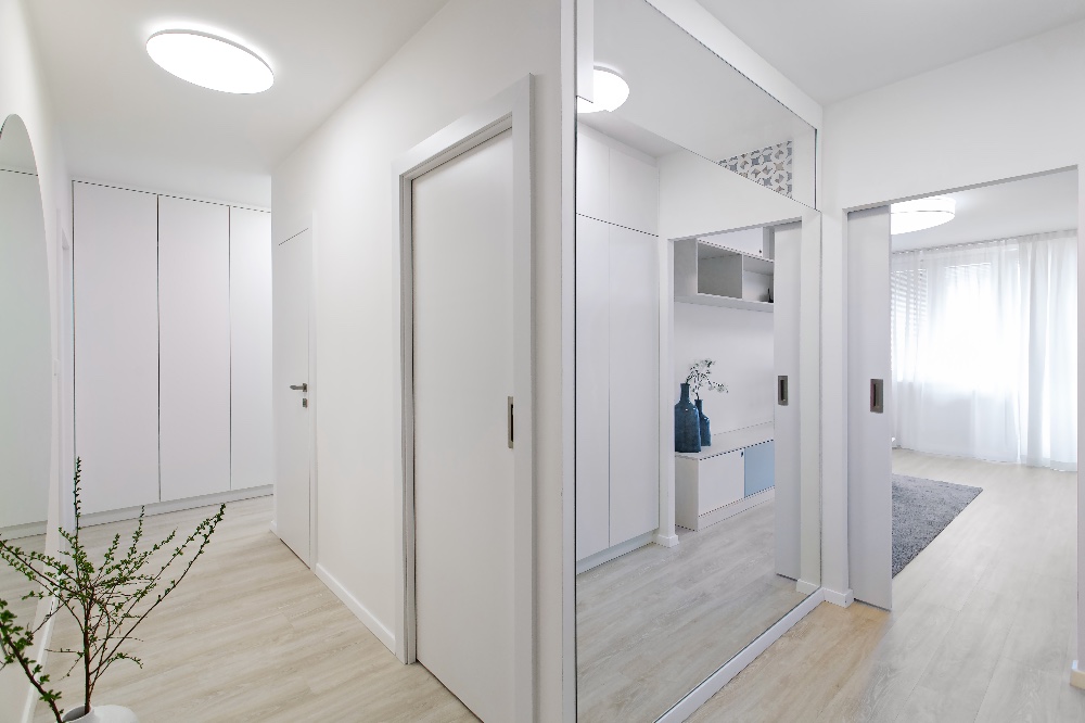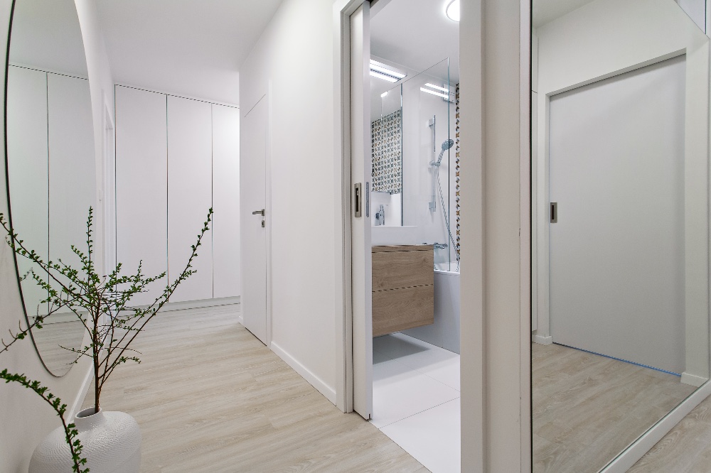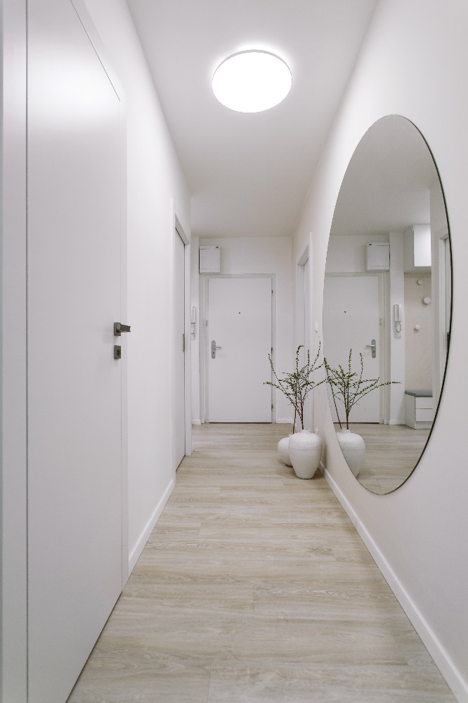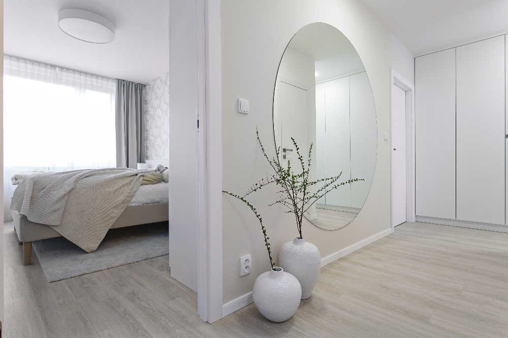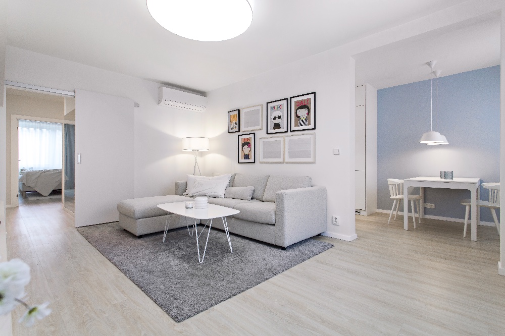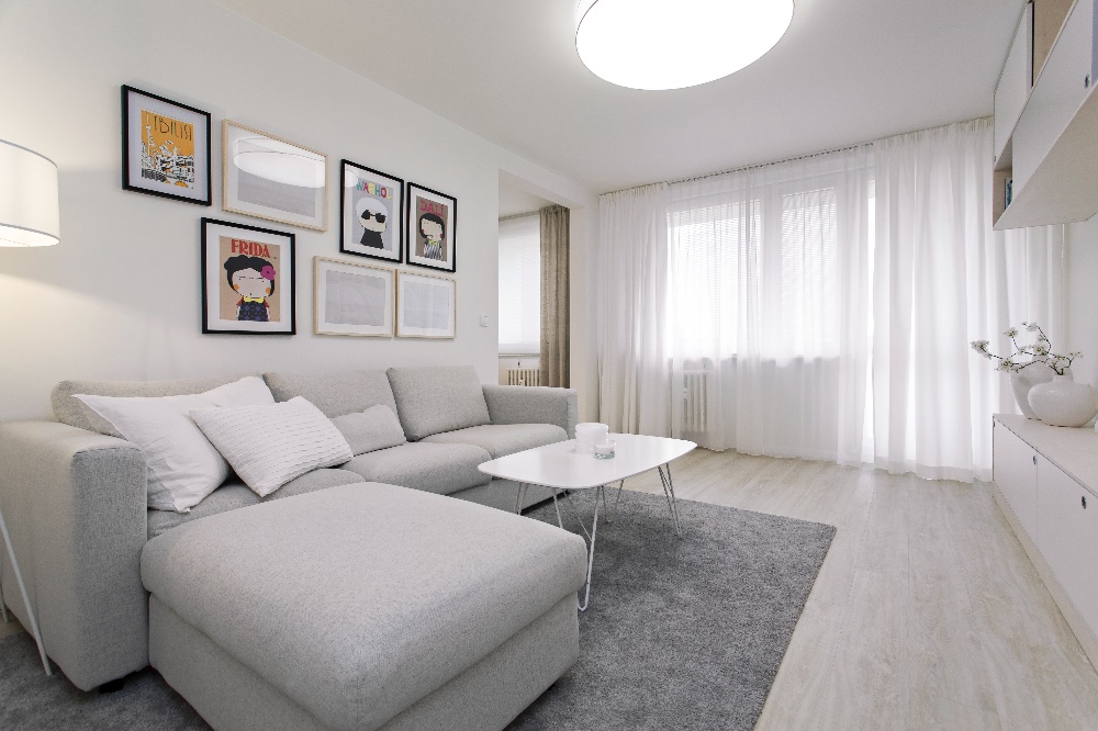 Tento přitažlivý a praktický interiér vytvořila designérka Markéta Fleischnerová ze studia MF art. Je určen pro život mladé ženy s výhledem do budoucnosti, kdy by ho mohla užívat i rodina s dvěma dětmi. Byt o rozloze 78 m2 byl v původním stavu s kovovými zárubněmi, umakartovým jádrem a starým linem. Majitelka toužila po krásném domově, přála si byt kompletně zrekonstruovat, ale sama si na to netroufla. Oslovila designérku a celkovou přestavbu financovala půjčkou. Dispozice místností se neměnily. Designérka jen více otevřela vchod mezi obývacím pokojem a kuchyní a mezi kuchyní a předsíní. Fotografiemi, které dnes visí v obývacím pokoji, se inspirovaly a od nich se i odpíchly. Čistota a vzdušnost interiéru však byla podmínkou! Další požadavek majitelky směřoval k prosvětlení koupelny. Tomu pomohlo vložení čirého skla, které propouští denní světlo, mezi koupelnu a předsíň. Optickému prosvětlení a zvětšení přispěla i zrcadlová plocha v předsíni.