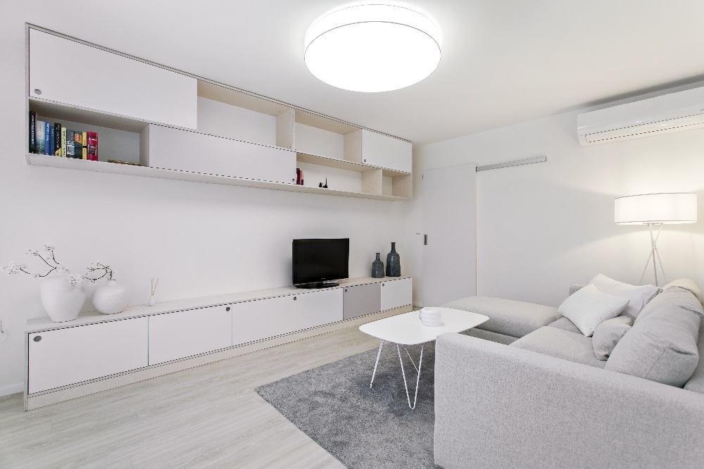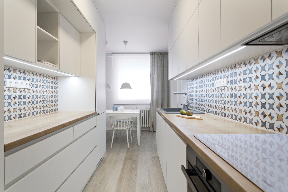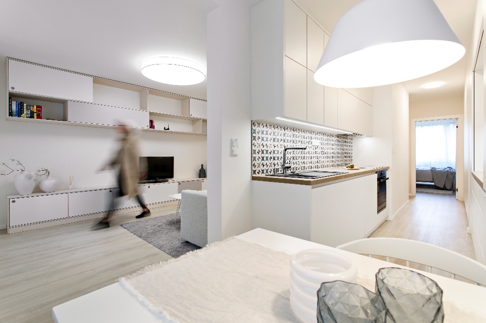 Zásadní optimalizaci však doznala kuchyň díky dvěma nábytkovým linkám umístěným proti sobě. Vznikl tak prostor pro velkou spíž, vestavnou chladničku a pračku, která se nevešla do koupelny. Stěnu obývacího pokoje bylo třeba rozšířit. Tudy nyní vedou odpady ke dřezu v kuchyni, jsou zde taženy rozvody elektřiny i odvod klimatizace vytažený až na balkon. Klimatizace zvládne chlazení obývacího pokoje i kuchyně, ale je záměrně umístěna tak, aby nebyla příliš nápadná. Zadní část bytu disponuje dostačujícím množstvím úložných prostorů, skříně navazují plynule na kuchyň. „Majitelka Bára schválila vše tak, jak bylo navrženo. Sice jsme diskutovaly například nad umístěním komod v ložnici, zda je sem, s ohledem na dostatečný průchod mezi nimi a lůžkem, vůbec začlenit. Protože mají hloubku pouhých 30 cm, možné to bylo. Na hostinský pokoj došlo až v druhém kole prací. Majitelka byla tak nadšená proměnou bytu, že zajistila další peníze na jeho kompletní dokončení.
