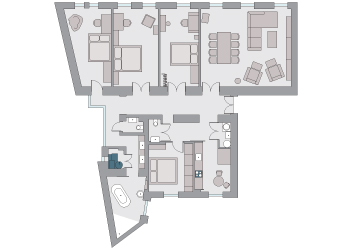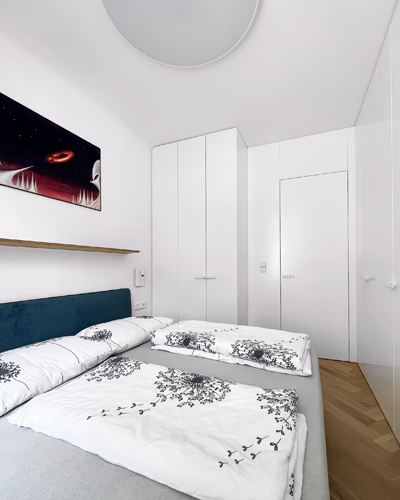 Klidnější část bytu s ložnicemi – hlavní ložnicí a dívčím, chlapeckým a dětským pokojem – je dál od vchodu tak, aby měl každý dostatek vlastního soukromí a prostor sám pro sebe.