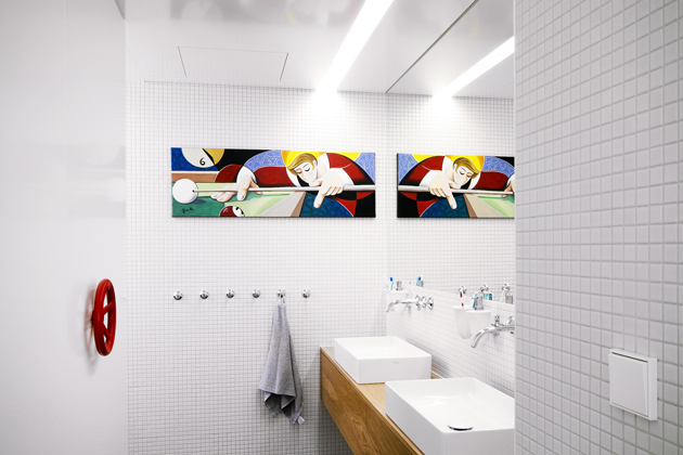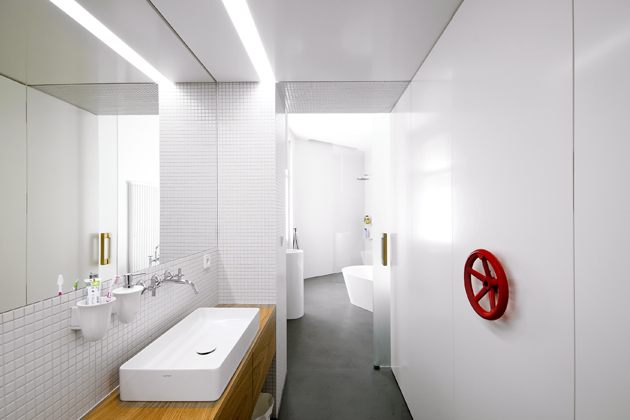 Do koupelny se vstupuje z původní dřevěné pavlače přes otevřený „předprostor“ s umyvadly, zatímco navazující část s vanou a sprchovým koutem je uzavřena v samostatné místnosti.
