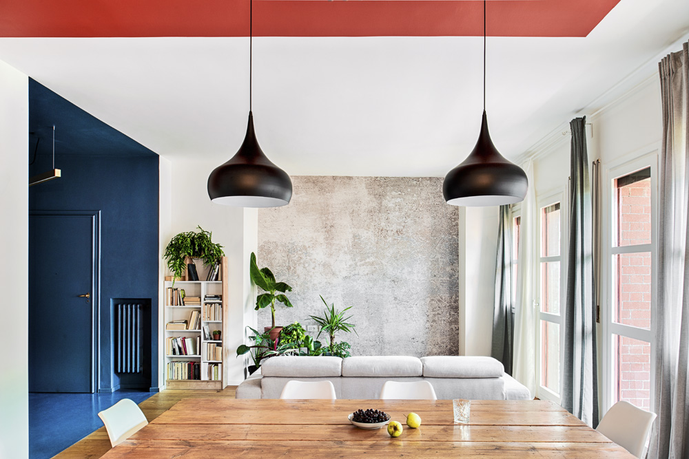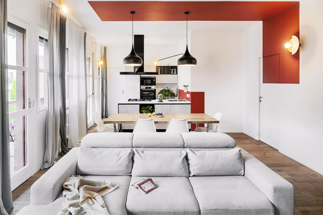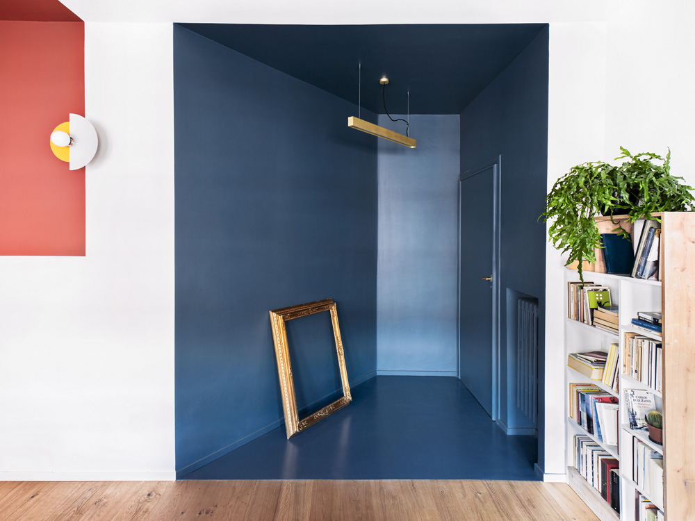 Byt o rozloze 130 m2 charakterizuje především výrazná barevnost. Architektka Francesca Melchiorre pracuje se skutečností, že barvy mají moc ovlivnit naši náladu, pocity i chování. Denní část tvoří hlavní obytný prostor propojující několik funkcí, který byl otevřen odstraněním původní příčky. Dřívě oddělená, zbytečně prostorná předsíň byla zmenšena a z její větší části vznikla technická místnost a praktická komora. Zároveň se otevřela do hlavního prostoru a oddělena je nyní především opticky, a to sytě modrou výmalbou stěn, stropu, podlahy, dveří a dokonce i radiátoru.