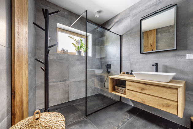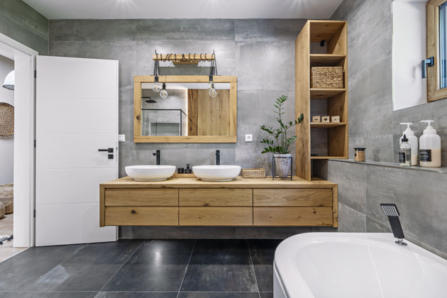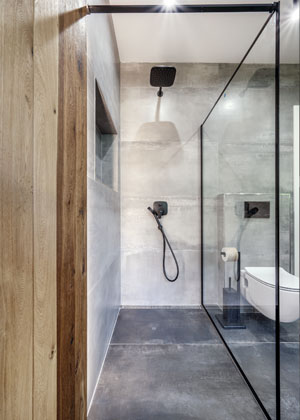 K nábytku z dubového dřeva zvolili šedé dlaždice, které celku vtiskly moderní ráz. Jako kontrast k umírněné barevnosti posloužily černé armatury a konstrukce sprchových koutů, které interiér decentně oživily. „V minulosti jsem v koupelně preferovala hlavně bílou barvu,“ vzpomíná paní Iva. „Teď jsem ale ráda, že jsme se rozhodli pro řešení, které je zajímavější i praktičtější. Na podlaze se nám osvědčila tmavá dlažba s dekorem rezavého plechu. Vypadá dobře, snadno se udržuje a nejsou na ní patrné šmouhy, kterým se v koupelně nikdy nevyhnete.“