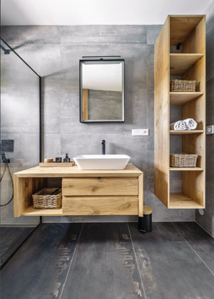 Do nového prostorného domu si majitelé mohli dopřát dvě koupelny – jednu v patře a druhou v přízemí, kterou mohou příležitostně využívat i hosté. Jako v celém domě je i ze zařízení koupelen patrné, že jejich obyvatelé preferují přírodní materiály. I když si však přáli zakomponovat do celého objektu masivní dřevo, dbali na to, aby ho nebyla přemíra a výsledek nepůsobil příliš rustikálně.
