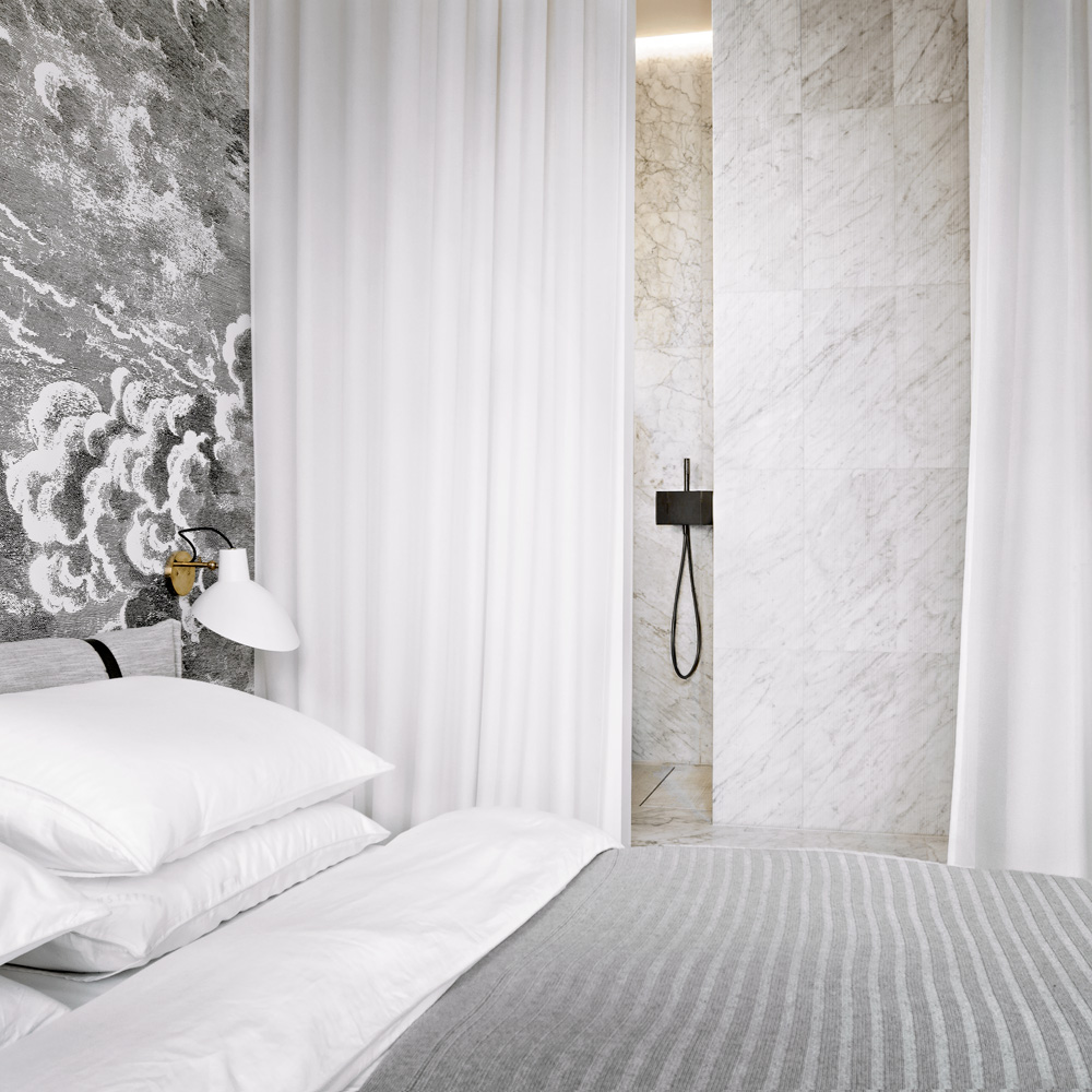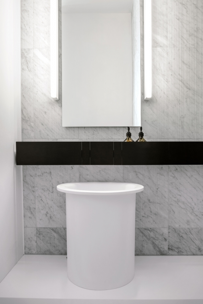 Aby interiér působil prostorněji, je koupelna otevřená do ložnice. Není přepažena žádnou stěnou, je zcela bez dveří a oddělená jen lehkým závěsem. Sprcha mizí za zdí obloženou mramorem. Při pohledu z ložnice není vidět sprchu ani umyvadlo. Klozet našel místo klasicky v samostatné WC místnosti za uzavíratelnými dveřmi.