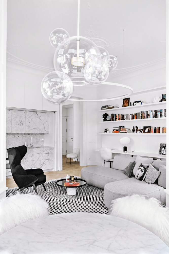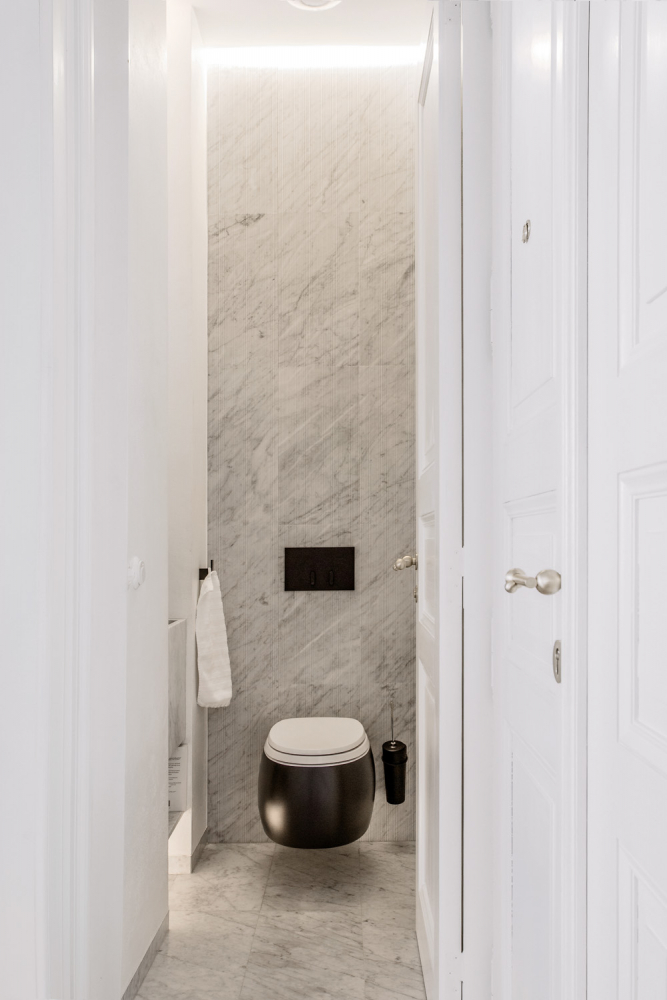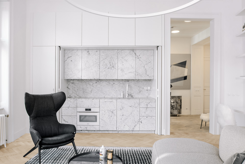 „Záměrně jsem je nechala někde neopravené a s většími spárami, abych zdůraznila jejich stáří,“ přibližuje svůj krok designérka Ivanka Kowalski. Celý byt je vymalován v odstínu lomené teplé bílé barvy. Koupelna, WC a kuchyň jsou obloženy jedním z nejznámějších luxusních mramorů na světě – kararským mramorem. Některé z nich zdobí frézovaný 3D povrch. Veškeré kliky jsou mosazné, na oknech ty původní a na dveřích nové extravagantní.