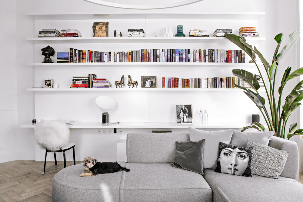 Vestavné prvky odrážejí dvojí tvář. Jednak tu, která odkazuje k původnímu stylu bytu, což je atypicky vyrobená sestava kazetových dveří a skříní u vstupu do bytu, a pak tu moderní – vestavné skříně v ložnici a část kompletně uzavíratelné kuchyně s bíle lakovanými frézovanými panely, kterou je za nimi možné zcela skrýt. Celek tím netratí na své praktičnosti, ale o poznání víc odhaluje svůj půvab. Vyniká tím jeho lehkost. Kromě solitérního nábytku bylo vše vyrobeno na míru podle návrhů designérky.