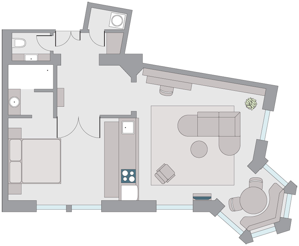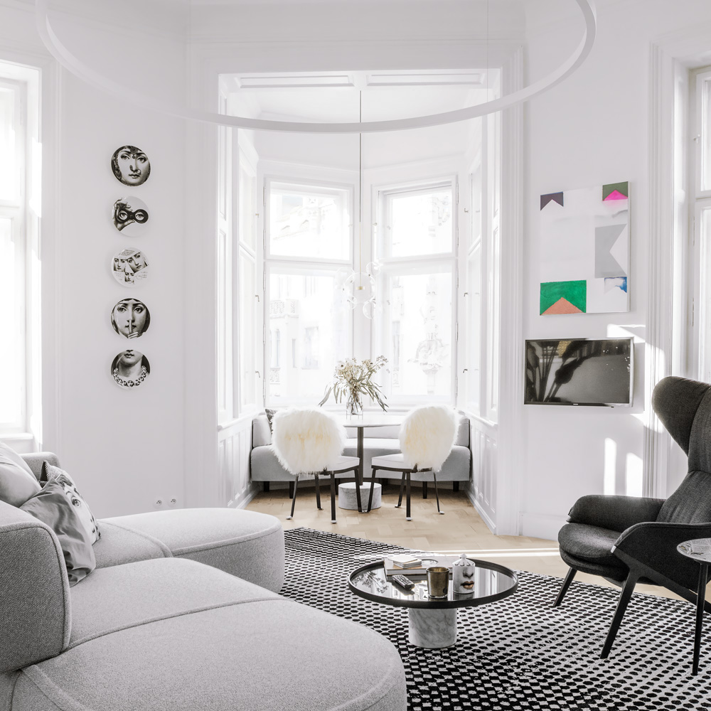V časech minulých se odehrálo mnoho nepříznivých událostí, které zasáhly nejen životní osudy lidí, ale poznamenaly i architekturu uplynulých století. To se stalo i v tomto případě. Polovina původního bytu byla velmi neuměle přizpůsobena a užívána jako samostatný byt. Rozměry je tak prostor interiéru, který neprošel téměř žádnou rekonstrukcí, určen jedné až dvěma osobám. Přestože se nacházel vybydlený a v zanedbaném stavu, naštěstí zůstaly zachovány původní prvky – okenní kličky, parkety i štukované stropy. Protože tu byly průchozí dva pokoje, bylo nezbytné radikálně změnit dispozici bytu tak, aby mohl být obývací pokoj situován v prostoru s nádherným rohovým arkýřem.