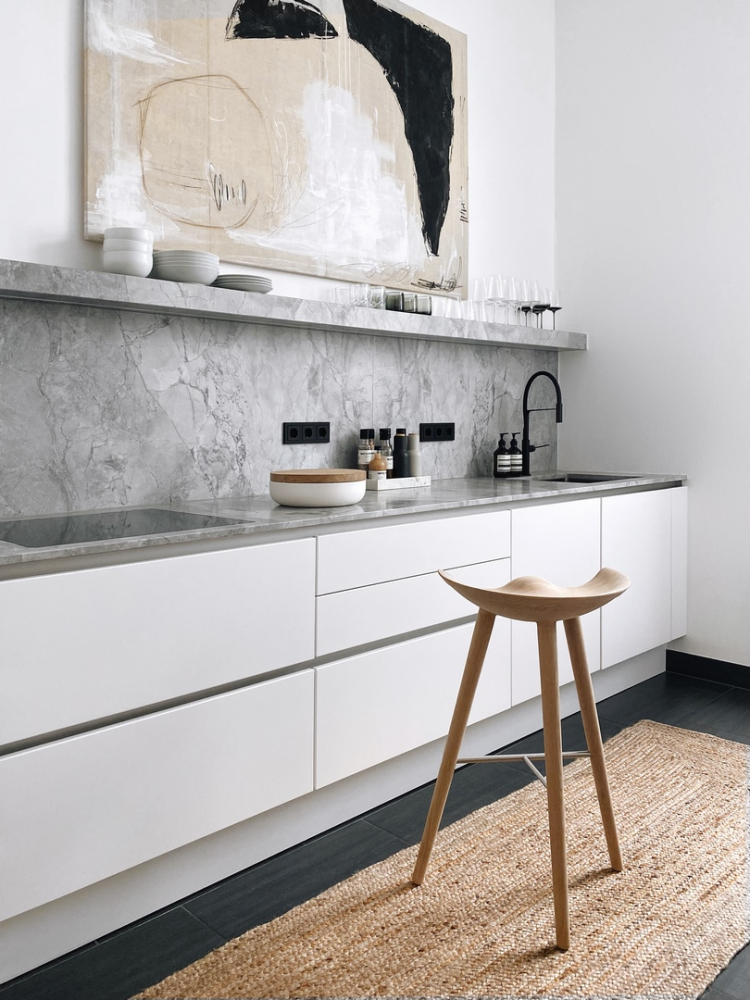 „Lidé, kteří chtějí vytvořit moderní styl, ve kterém se budou cítit dobře, by měli kombinovat světlý nábytek, organické dekorace, krásné vázy, zajímavé knihy a časopisy," říká Sebastian. Do svého návrhu kuchyně také zakomponoval přírodní materiály, jako je mramor z Carrary, juta a dřevo.