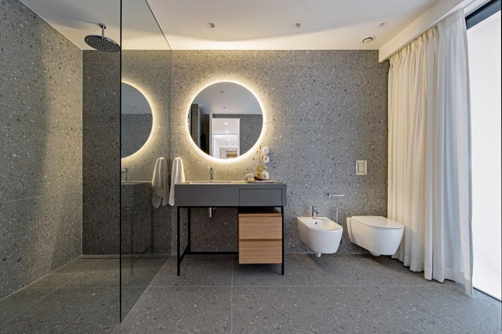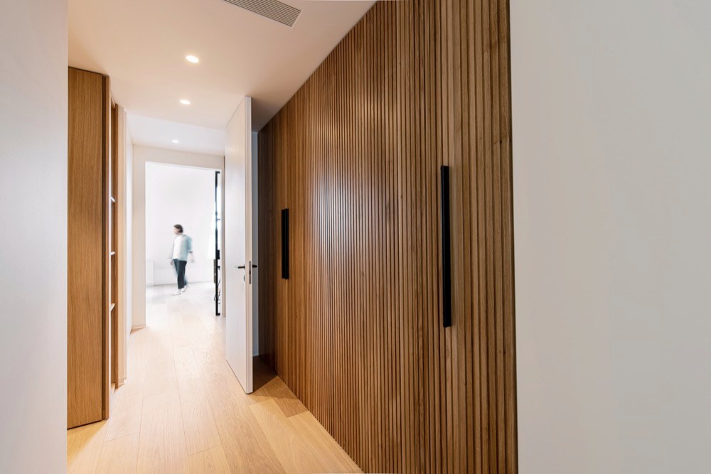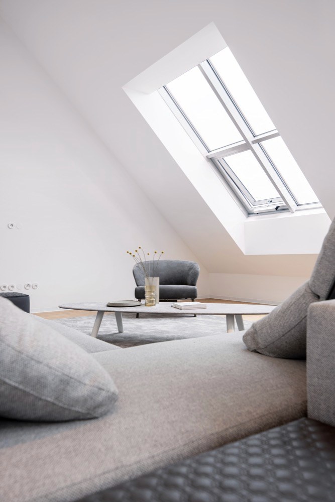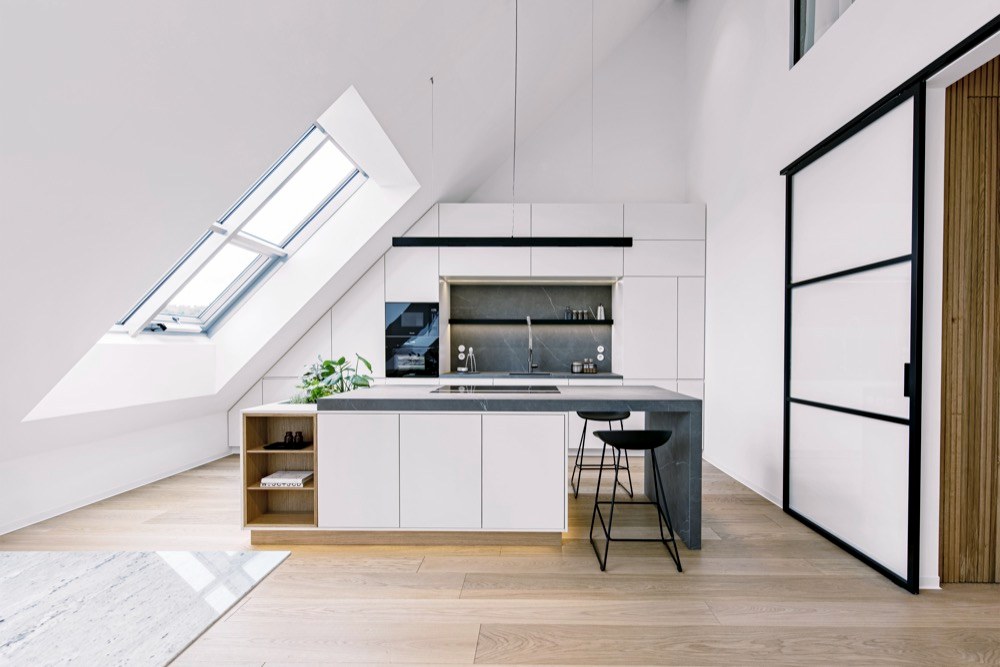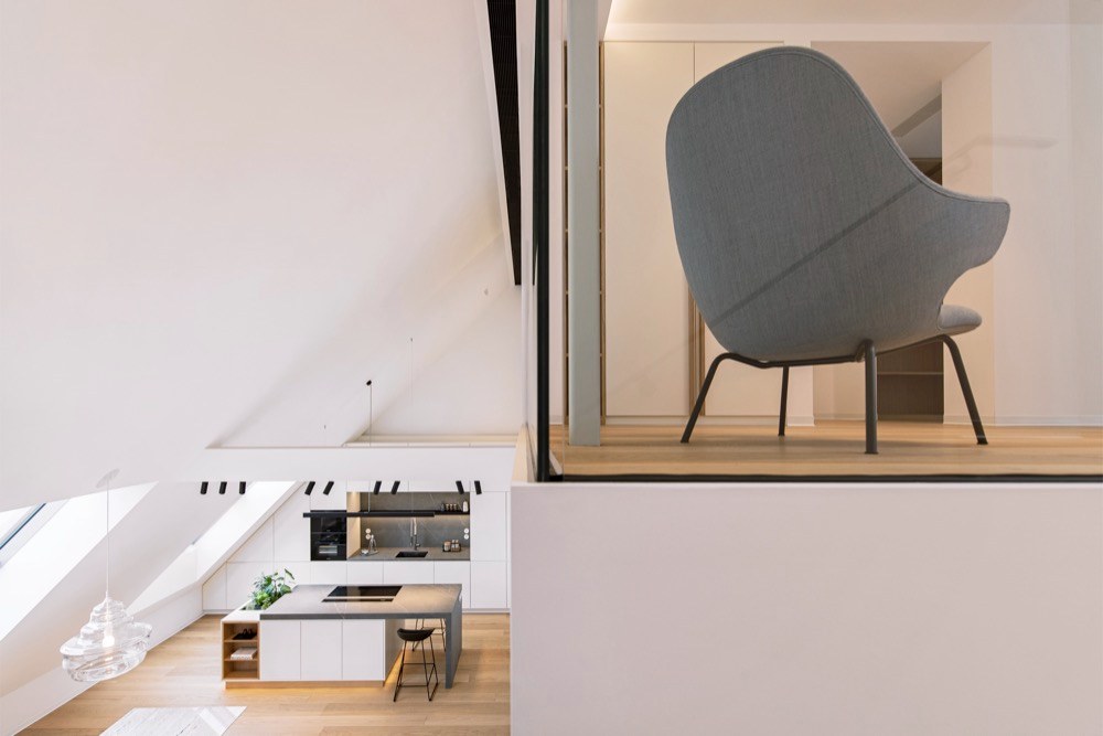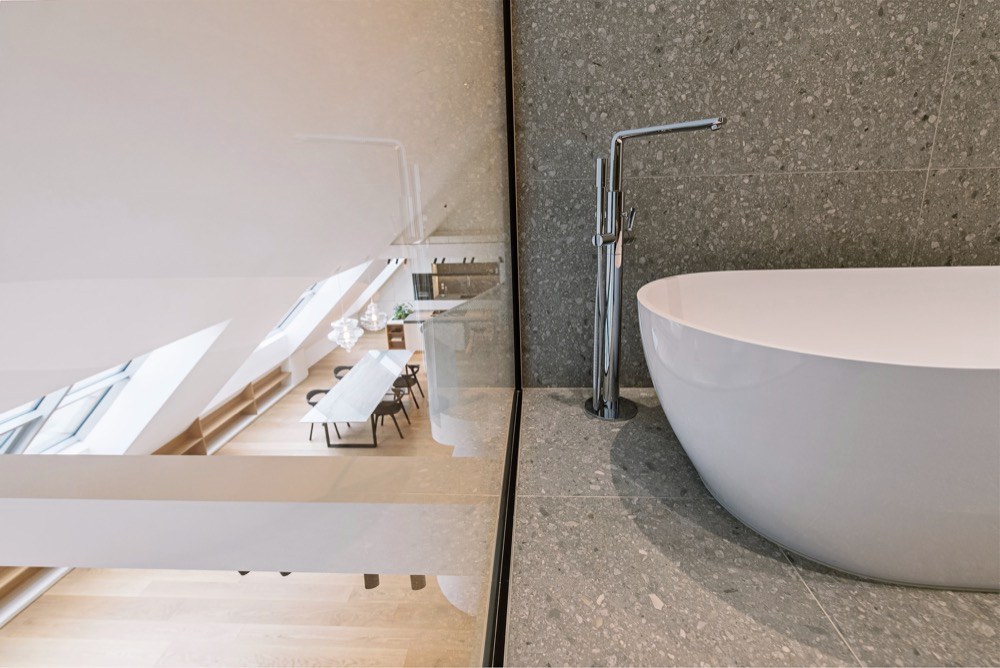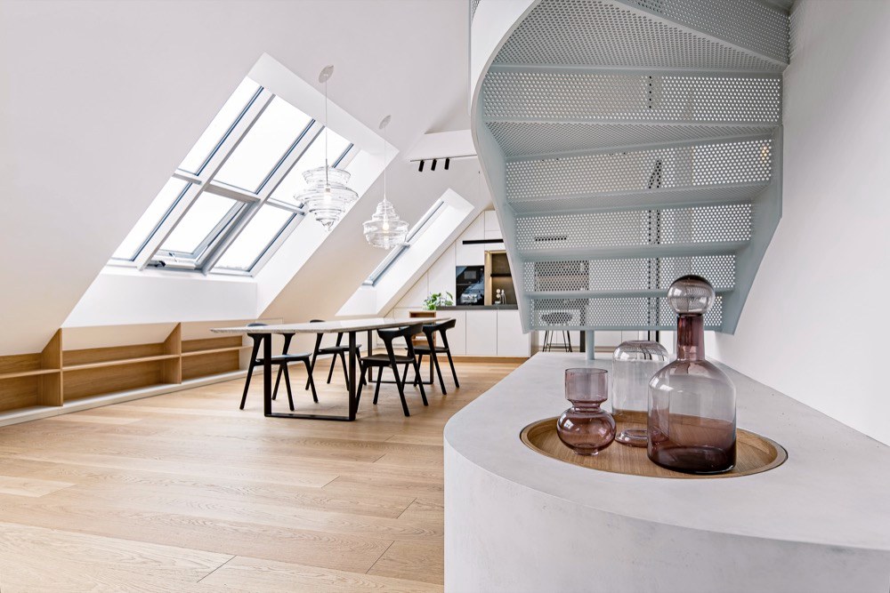 Přirozené světlo je v prostoru využíváno ke zdůraznění horizontálního panoramatického výhledu, a navíc k vytvoření vertikální osy mezi jednotlivými podlažími. Tento jedinečný penthouse o rozloze bezmála 250 metrů čtverečních se může pyšnit tím, že do historické budovy vnáší zcela nový moderní rozměr. Celý interiér sestává z kombinace prvotřídních materiálů a spotřebičů prémiových značek. To mu pak dodává punc luxusu, který ale není nikterak okázalý, nýbrž sofistikovaně příjemný.