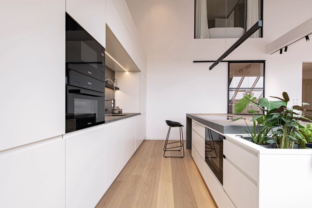 Za hlavní zónu bytu můžeme bezesporu považovat kuchyň. Ta byla od počátku řešena na míru a s ohledem na to, že se jedná o místo, ve kterém majitelé tráví velmi mnoho času. Není tedy divu, že srdce tohoto domova je velkoryse propojené s obývacím pokojem. Dvoupodlažní prostor upoutá pozornost každého, kdo sem vstoupí, a to nejen svými vysokými stropy, ale především velkoformátovými prosklenými plochami. Ty vytvářejí unikátní propojení interiéru s řekou i nebem. Bezpochyby zajímavým a dominantním designovým prvkem je pak sada závěsných svítidel, která dominuje celému obývacímu prostoru.