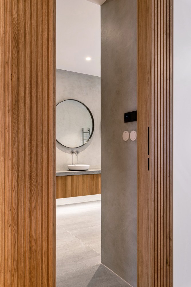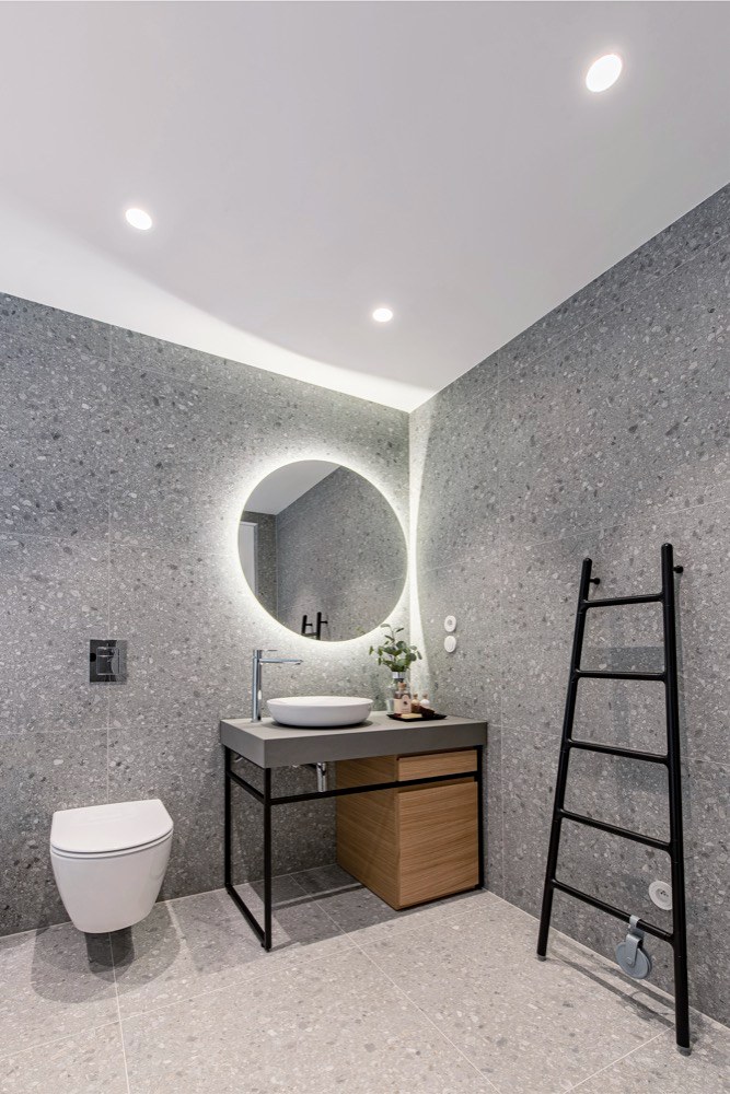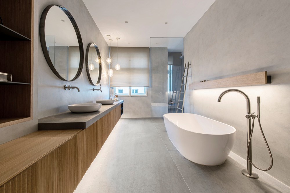 Typická výška stropů, jež je pro původní pražské činžovní domy standardní, umožnila architektům prosklení i horního patra. To zajistí dostatečný přísun přirozeného denního světla i do koupelny, umístěné v druhém patře bytu. Jedná se o skutečně zajímavé architektonické vyjádření, kdy i během intimních momentů mohou obyvatelé udržovat neustálý kontakt s vnějším okolím a pozorovat život na vodě. Případnou touhu po soukromí zajistí závěsy, které během pár vteřin přetvoří celý prostor a zároveň vybízejí ke hře světla a stínů. Architekt Marco Maio lpí na detailech. Jeho studio si tak při koncepci bytu dávalo záležet i na těch nejmenších drobnostech.