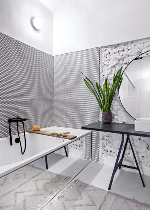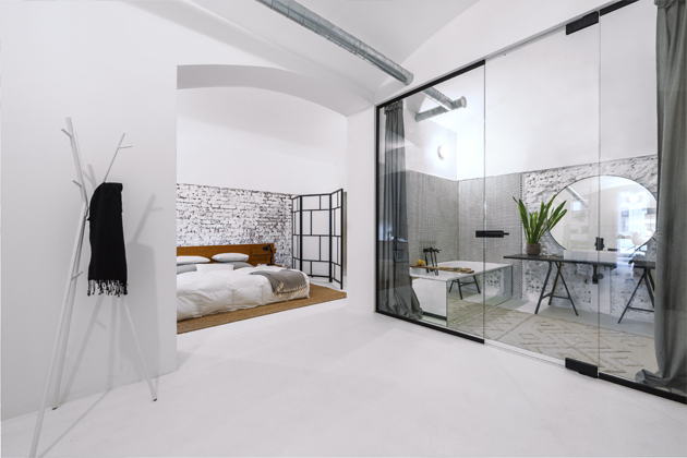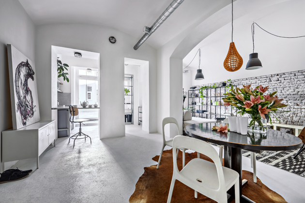 Celý byt, kromě technické místnosti s pračkou, má klenuté stropy vysoké tři a půl metru. V částech interiéru architektka nechala sejmout poškozené omítky a odhalila cihlové stěny, které ve výsledku efektně podpořily industriální vzhled celku. Podlaha z litého betonu skrývá teplovodní podlahové vytápění, které zajišťuje komfort bytu a teplo sálající od nohou.