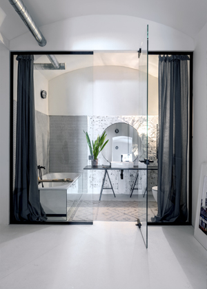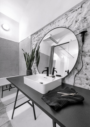 A z druhé strany do ulice byla v prostoru vytvořena předstěna s větráním. Dnes sem proniká denní světlo, odpoledne tu krásně svítí slunce, které prostoupí celým bytem.“ Prosvětlení a provzdušnění celého interiéru architektka dosáhla také odstraněním všech příček, které nebyly nosné. Koupelna s vanou našla místo v prostoru dřívější kuchyňky. Z důvodu lepších světelných podmínek s dosahem denního světla je kompletně oddělena prosklenou příčkou s dveřmi.