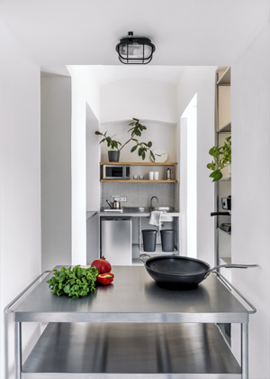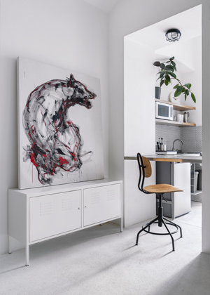 Kdysi nejspíš technické prostory v domě postaveném na konci 19. století, později předělané na nevzhledné kanceláře, upoutaly pozornost architektky a rozehrály její představivost. Tmavé kanceláře se skladem nechala vyjmout z nebytového fondu a z pětasedmdesáti metrů čtverečních vytvořila přitažlivý interiér. „Možnost vyjít z bytu ven do velkého prostoru terasy či zahrady mi přišla výjimečná,“ prozrazuje prvotní impuls pro koupi bytová architektka Andrea Polach a vysvětluje: „V části dnešní kuchyně byly dříve záchody kanceláře, tím sem byl téměř zcela zamezen přístup denního světla. A z druhé strany do ulice byla v prostoru vytvořena předstěna s větráním. Dnes sem proniká denní světlo, odpoledne tu krásně svítí slunce, které prostoupí celým bytem.“ Prosvětlení a provzdušnění celého interiéru architektka dosáhla také odstraněním všech příček, které nebyly nosné. Koupelna s vanou našla místo v prostoru dřívější kuchyňky. Z důvodu lepších světelných podmínek s dosahem denního světla je kompletně oddělena prosklenou příčkou s dveřmi.