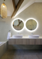 Proměna koupelen představuje skvělé uplatnění designu, který se opírá o dokonalou funkčnost a moderní estetiku. Robustní deska z umělého kamene Staron vytváří ve spojení s dubovými policemi praktické a esteticky příjemné prostředí. V obou koupelnách dobře vynikne odkrytý krov s nově obroušenými plochami. Dřevěné trámy dodávají interiérům autentičnost a barevně dobře ladí s betonovou stěrkou v odstínu slonové kosti. I když jsou koupelny zařízeny docela minimalisticky, byl jim díky volbě materiálů a povrchových úprav ponechán lehký rustikální nádech, který tu pomáhá vytvářet harmonickou atmosféru. Béžovo-bílou paletu oživují mosazné prvky a závěsné ratanové svítidlo. Eleganci a nadčasovost koupelnám propůjčuje i jednoduchá béžová dlažba.