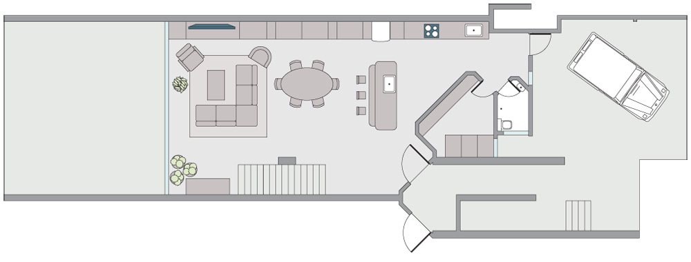 Jako první přišlo na řadu sjednocení hlavního obytného prostoru. Původní příčky, které oddělovaly kuchyň od obývacího prostoru a schodiště, byly odstraněny. Uzavřené a vzájemně oddělené místnosti tak byly propojeny v plynulý a vzdušný prostor, což významně pozvedlo kvalitu žití a vytvořilo místo otevřené komunikaci a vzájemnému sdílení.