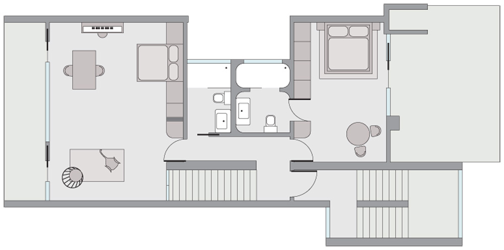 Výrazná centrální vestavba získala významnou úlohu i v prvním patře. Jejím umístěním uprostřed prostoru došlo k maximálně funkčnímu rozdělení prostoru na ložnici a multifunkční pracovnu s potenciálem pro vznik ložnice pro hosty. Středový panel důmyslně skrytý za designem skříně totiž kromě dvou koupelen ukrývá i výklopnou postel a dělicí příčku k případnému oddělení pracovny od prostoru pro hosty. Díky velké barvené ploše, kterou vestavba představuje, je však velmi netradičním způsobem zachována soudržnost prostoru.