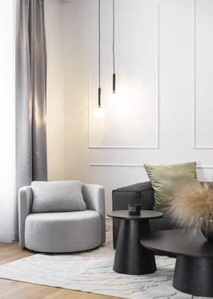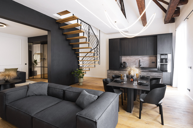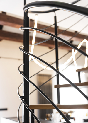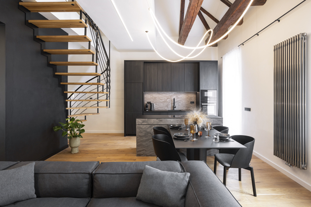 Velkou pozornost autorka interiéru věnovala také osvětlení. „Vzhledem k tomu, že se jedná o historický byt, má velmi vysoké stropy – v mezonetové části až šest metrů! Zvlášť zábavný byl výběr svítidla nad jídelní stůl. Rozhodli jsme se instalovat netradiční světlo.