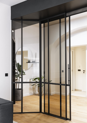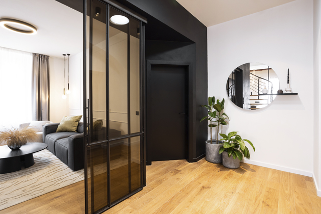 V souladu s tím jsme se zaměřili především na kontrast stěn a materiálů – vzhledem k tomu, že prostor je sám o sobě hodně prosvětlený, zvolili jsme vizuálně dominantní tmavou kuchyň. Podobně jsme přistoupili také k centrální stěně prostupující obytným prostorem – dostala černý nátěr a v jedné části jsou do ní integrovány také černé dveře do ložnice,“ popsala interiérová designérka. Stěna samotná funguje jako významné vizuální uzemnění, skvělý doprovod jí pak poskytují charakteristické industriální prvky, ohromná kovová prosklená příčka, lokálně využité kamenné obklady i všudypřítomné dřevěné podlahy.