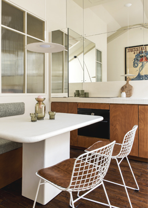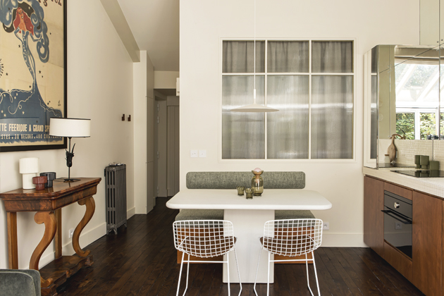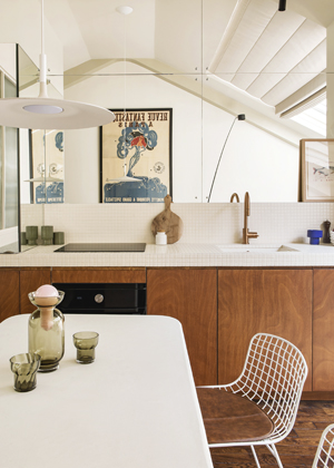 Protože byt slouží k příležitostnému pronajímání a měl by skýtat útočiště až čtyřem obyvatelům, soustředila se designérka na maximálně efektivní práci s prostorem. Musela přitom počítat se zkosením stropu, které ubírá potenciálně využitelné centimetry. Logicky se zaměřila na prvek, který je dominantou celého prostoru – kuchyň. Její horní skříňky ukryla za nýtovanými zrcadly, které efektem zrcadlové stěny krásně opticky rozšiřují prostor. Ty doplňuje spodní řada skříní s pohledovými plochami z dýhy z dřeva okumé. Na nich je usazena betonová deska obložená mozaikou z drobných čtverečků, která přechází do nástěnného obkladu. Bílá linka pokračuje keramickým dřezem, který je elegantně zapuštěn a vybaven měděnými detaily, včetně stojánkové baterie. S designem desky dále koresponduje jídelní stůl z leštěného betonu od The Concrete Table, bílé drátěné židle i svítidlo Aplomb od Foscarini. Hlavní osvětlení doplňují drobná nástěnná svítidla, která dávají interiéru jemný retro nádech, i techničtější stropní svítidla osvětlující tmavší kouty kuchyně. Obývací část pokoje je vybavena pohovkou, kterou lze rozložit a využít k občasnému přenocování. Proto designérka myslela i na vhodné zatemnění oken, na něž pamatovala zatmavovacím závěsy a plissé roletou střešního okna.