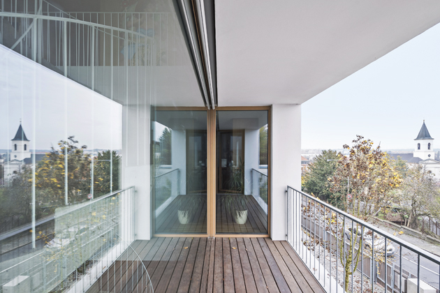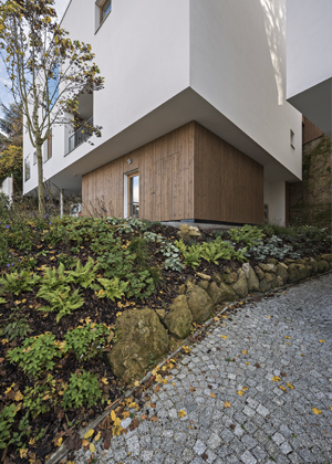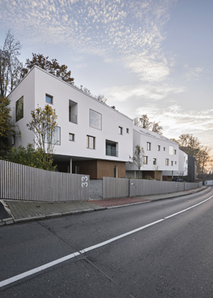 Minimalistický vzhled celého projektu je výsledkem dlouhého dialogu s klienty i úřady. Dvojice krajních domů má valbové střechy, které zjemňují jejich objem, zatímco mezi jednotlivými objekty vyniká skalní stěna jako rozšiřující se předěly. Prostor před stavbami směrem k ulici získal městský charakter díky kamenné dlažbě a nově vysazeným stromům, zatímco zahrada na svahu za domy zůstává divoká a využívá původní vzrostlou vegetaci. „Všechny tři objekty jsou vizuálně vyzdviženy o podlaží nad úroveň parteru; bílé archetypální abstrahované hmoty tedy pomyslně levitují nad půdorysně menším a materiálově odlišeným spodním podlažím.