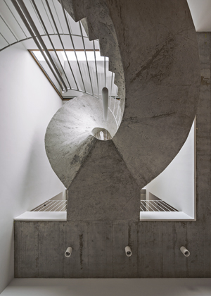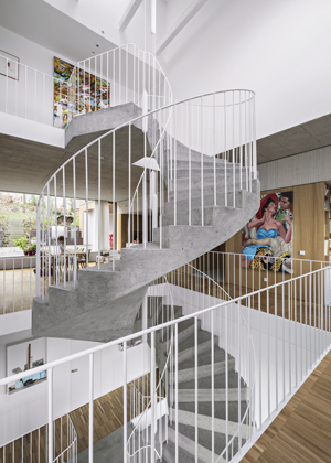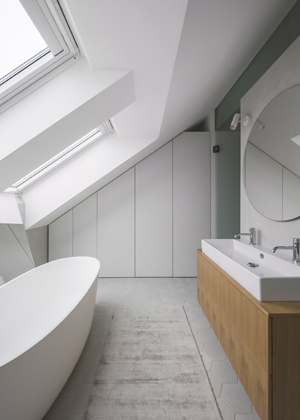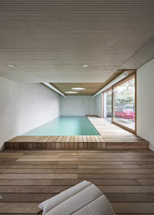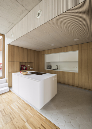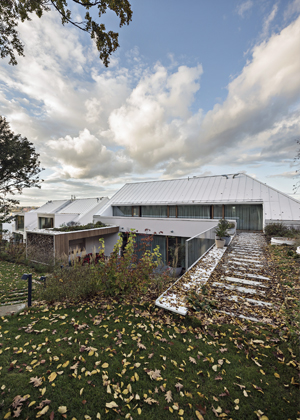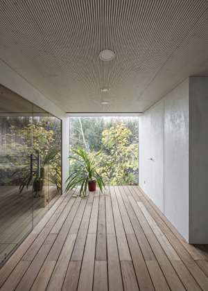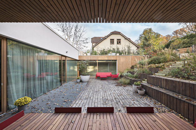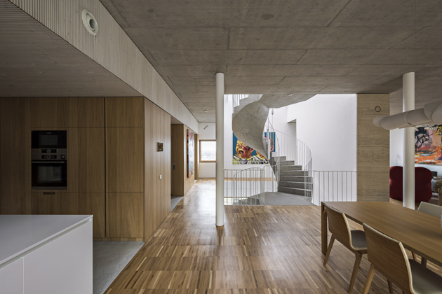 Dům investora navíc disponuje vnitřním bazénem a venkovní kuchyní s vegetačními střechami vymezujícími terasu. Interiéry odrážejí filozofii celého konceptu – bílé omítky, vestavný nábytek, přírodní dub i pohledový beton dohromady tvoří jednoduchý a harmonický základ pro každodennost odehrávající se na pozadí výjimečné lokality a jedinečně uchopeného prostoru.