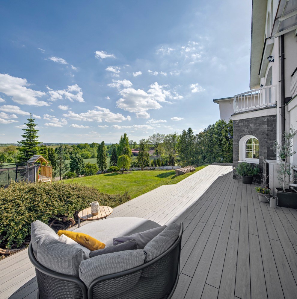 Postupně dochází i na zvelebování nejbližšího okolí domu. Původně uvažovali o dřevěné terase, ale kvůli obavám z údržby nakonec sáhli po dřevoplastu Twinson. Terasový systém Majestic Massive Pro (Twinson) má na povrchu tenkou vrstvu PVC, takže připomíná autentické přírodní dřevo, ale je zcela bezúdržbový. Manželé si vybrali odstín kouřově šedý dub, který je nejsvětlejší, a proto se nerozpaluje od slunce. Terasu nyní mohou bezpečně celoročně využívat nejen dospělí, ale i děti.