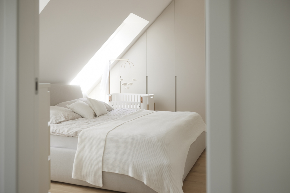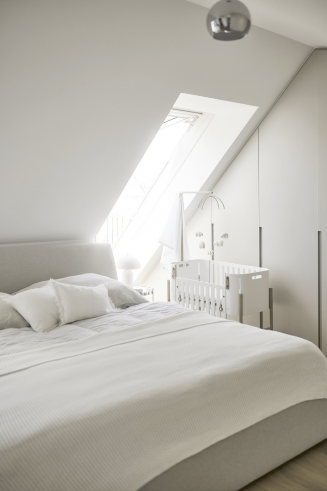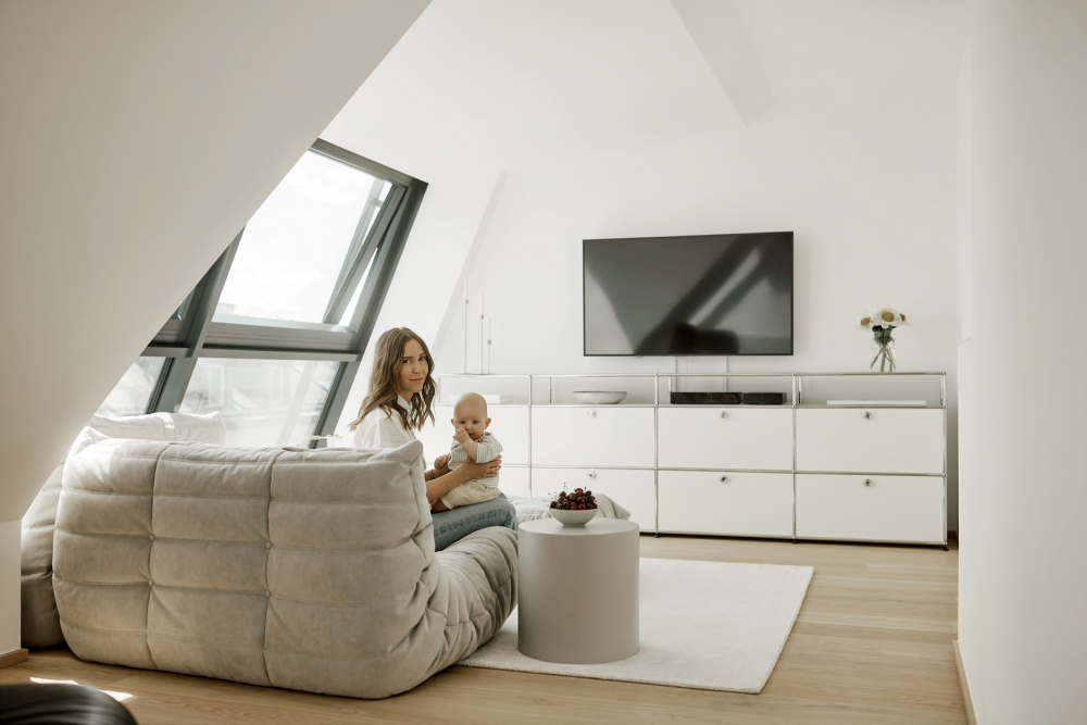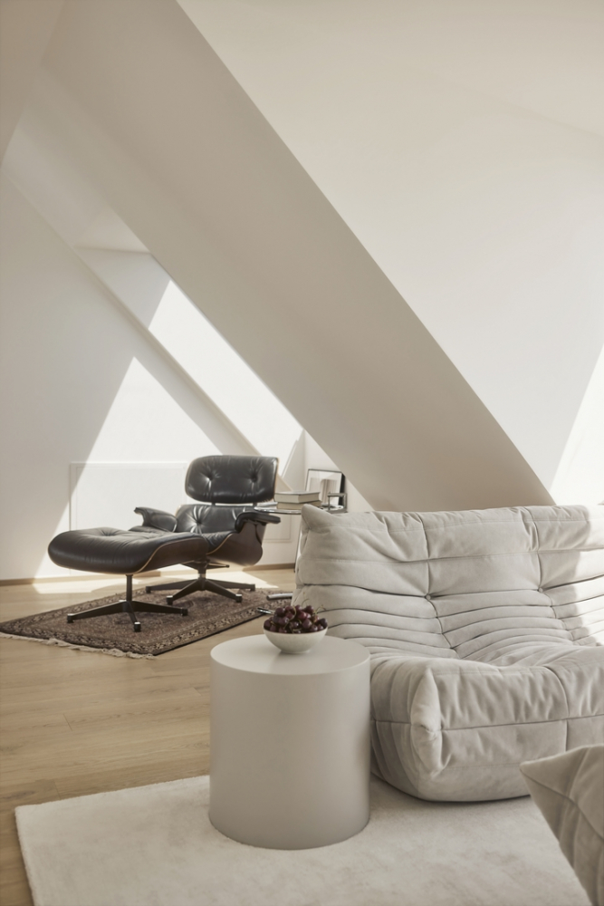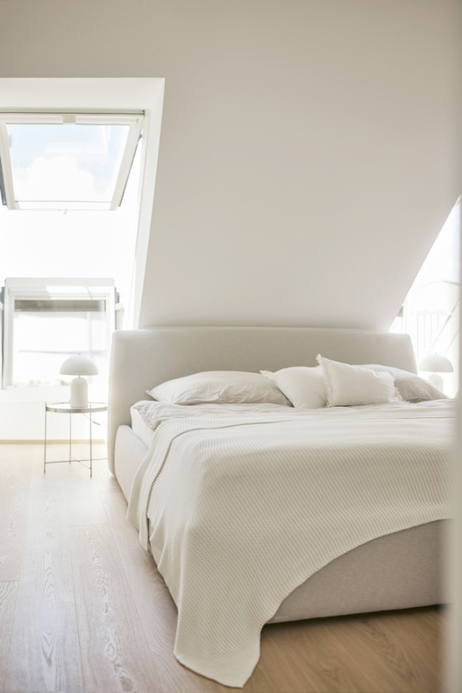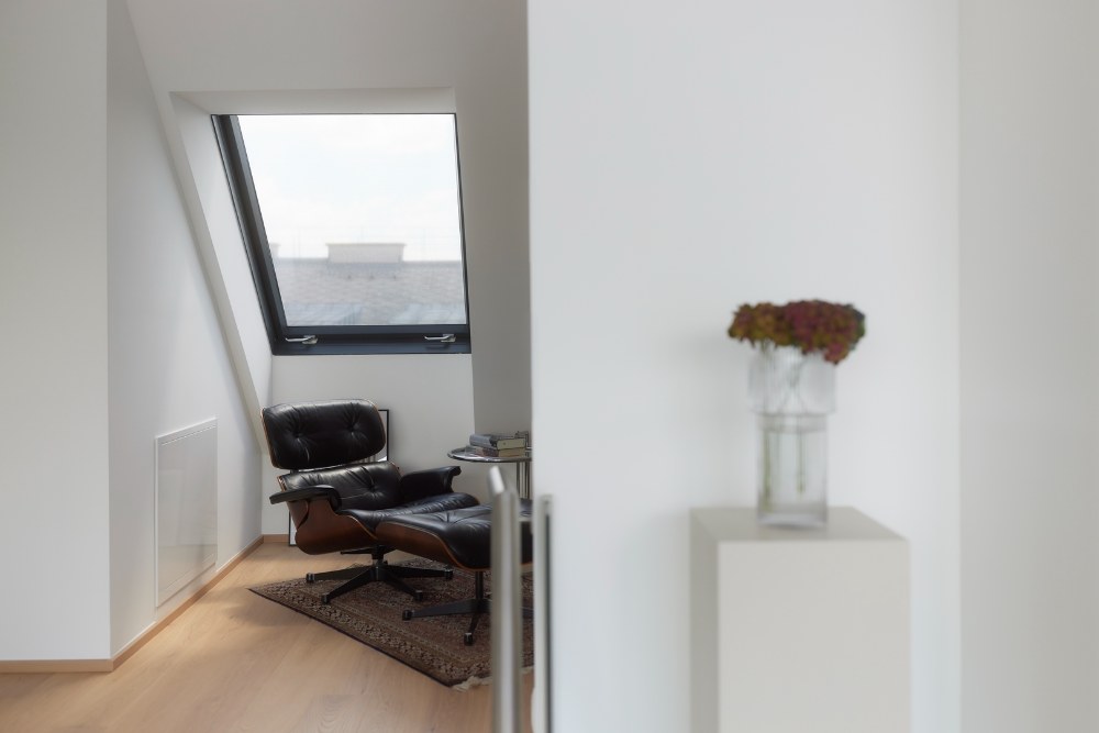 Díky otevřenému prostoru je půdní byt útulný i přes šikmé stropy. Velká okna poskytují jasný výhled ven. Přestože jsou Katharina a její manžel příznivci nadčasové klasiky, dbali také na to, aby interiér nebyl nudný a příliš sterilní.