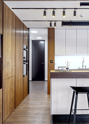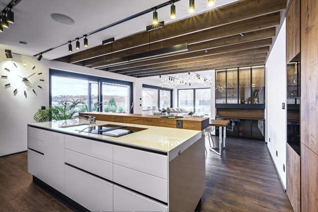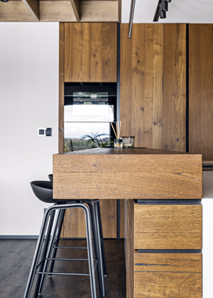 Kuchyňskou část tvoří linka nábytku, rovnoběžně umístěný ostrůvek a kolmo situovaný vysoký modul s vestavěnými spotřebiči a úložnými prostory. Na spodních skříňkách u stěny je tenká pracovní deska zhotovena z keramiky s jemným mramorovým dekorem, který zdobí i obložení přilehlé stěny. Linka bíle lakovaných skříněk ve vysokém lesku je zakončena stěnami s dřevěnou dýhou, na něž po obou stranách navazují dveře do přilehlé haly. Významnou roli v kuchyni hraje široký ostrůvek, který poskytuje úložné prostory z obou stran. Kromě varné desky tu mají majitelé k dispozici i druhý, menší dřez, který využívají na rychlé oplachování surovin při vaření. Na ostrůvku je speciální pracovní deska Level O2, která obepíná i jeho bočnice. Část ostrůvku z pohledu od jídelního stolu a užší barový pult tvoří falešné dřevěné trámy, které svým odstínem a dekorem ladí s dřevěnou dýhou použitou na obkladu některých stěn a nábytku. Ve vysokém modulu jsou umístěny trouby, chladnička a vinotéka, pod kterou je část povrchu opatřena tmavým sklem, jímž návrhář stranově vyvážil obraz protilehlých trub.