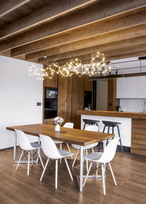 Na ostrůvek zakončený barovým posezením navazuje jídelní stůl s dřevěnou deskou a kovovou konstrukcí. Osvětlení tu zajišťuje široká lampa, kterou tvoří několik prostorově tvarovaných svítidel. Součástí jídelního koutu je prosklená vitrína a spodní skříňka s tmavým sklem, za kterým jsou ukryté kabely a další potřebně prvky k televizi umístěné na opačné straně přilehlé stěny. Dokonalé prosvětlení celého integrovaného prostoru zajišťují tři velká francouzská okna, která poskytují výhled na terasu a do okolí.