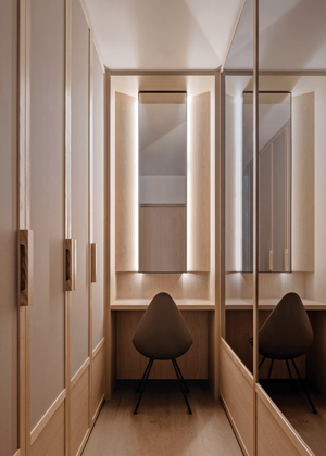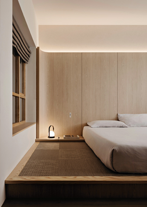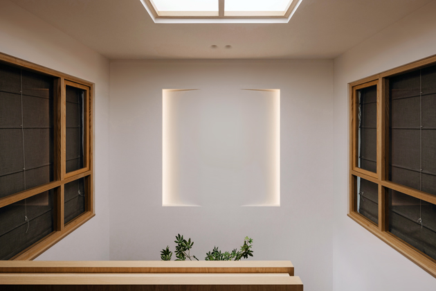 Ústředním motivem horního patra je pocit ticha a klidu, který okamžitě vnímáte a ke kterému velkou měrou přispívá volba osvětlení. To je až na zřídkavé výjimky řešeno nenápadnými zapuštěnými zdroji s uklidňujícím měkkým světlem. Úložné prostory splývají s ostěním, aby nepůsobily rušivě, a jejich přítomnost naznačují jen úchyty. Hlava postele v hlavní ložnici je maximálně minimalistická, pracuje se zakřivenými objemy původní konstrukce, aby zachovala kontinuitu a eleganci. Nově vytvořená střešní okna přispívají ke světelné pohodě i v obou koupelnách. Také díky nim tu nepůsobí hrany nijak ostře.
