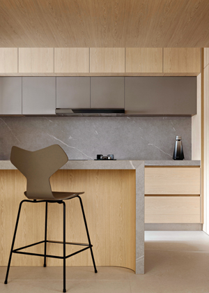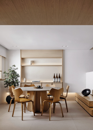 Jídelní kout u paty schodiště doplňuje na zakázku vyrobená vitrína, hladce integrovaná do stěny. Stůl s jídelní deskou ve tvaru kruhu, který symbolizuje spojení a ochranu, podporuje harmonické uspořádání a atmosféru celistvosti. Kuchyň situovaná přímo naproti schodišti je ze tří stran uzavřená, ovšem zpředu se otevírá do prostoru a jedinou bariéru představuje jednoduchý barový pult. Posuvné zástěny z jasanového dřeva elegantně rozdělují prostor obývacího pokoje a po jejich odsunutí se nabídne klidný pohled do zeleně venkovní zahrady.