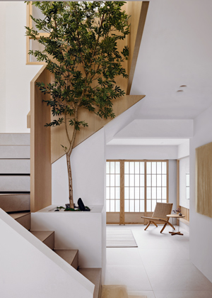 Interiér spodní společenské části bytu je rozčleněn do nenápadných zón uzpůsobených pro různé formy sociální interakce, setkávání, konverzaci. Jednotlivé zóny jsou ve společenské části mezonetu vizuálně odděleny pro Asii tak typickými posuvnými zástěnami z jasanového dřeva, které dovolují modulovat prostor podle momentální potřeby.