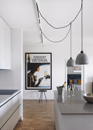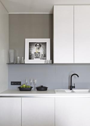 Ostrůvkovou kuchyň nechala Monika White vyrobit na zakázku u českého výrobce Indeco, s nímž často spolupracuje při realizacích soukromých interiérů i při kancelářských projektech. V zájmu zachování vzdušnosti a prostoru vsadila na minimalistické řešení kuchyňské linky, jejímž základem je povrch v bílém lesku, obklad z šedého kaleného skla a pracovní deska z lamina značky Egger a z tvrzeného kamene Technistone (na ostrůvku). K základním skříňkám nechala vyrobit i vestavný špajz, který rozšířil v původním návrhu podceněné úložné kapacity. K bílému základu zvolila doplňky v černém a šedém ladění.