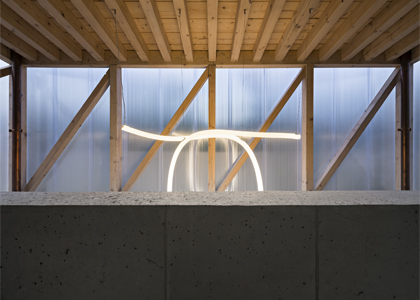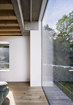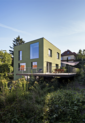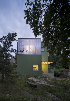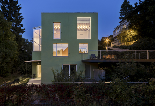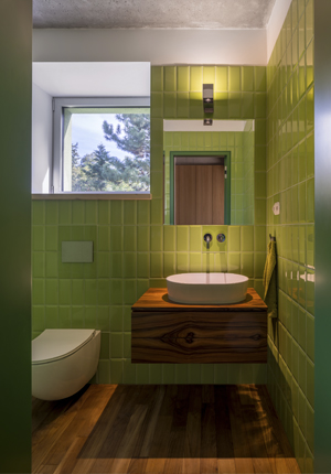 Pracujeme pečlivě s různými podobami světla, s intenzivním oblohovým světlem, rozptýleným měkkým světlem za polopropustnou fasádou či s kontrastním šerosvitem, což zpětně ovlivňuje sofistikovanou kompozici otvorů fasády.“ Použití kvalitních a autentických materiálů, důmyslná práce s barvami a texturami i maximální pohodlí jsou charakteristické pro celou realizaci. Fasáda ve výrazném odstínu zelené je z ušlechtilé škrábané omítkoviny – v dokonalém souladu s okolní vegetací bohatou v každém ročním období.
