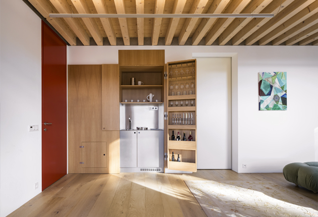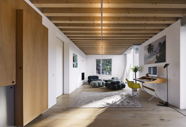 V nejvyšším patře je pracovna a salon s krbem a velkým oknem od podlahy ke stropu, které poskytuje výhled přes řeku a do interiéru propouští dostatek denního světla za každého počasí. Součástí je také čajová kuchyňka s lednicí ukrytá v nábytkové stěně.