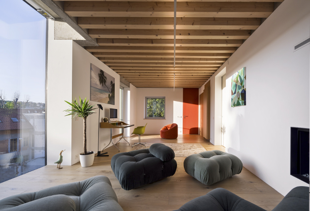 Za společenskou zónou se nachází soukromá část – ložnice, šatna a modrá koupelna. „Dům je vybaven na míru vyrobeným vestavěným nábytkem, který v sobě zahrnuje potřebné servisní funkce a zakrývá vstupy do soukromých částí domu. Speciálně pro dům byly navrženy stoly z leštěného masivu tropické dřeviny padouk na ocelové konstrukci. Interiér ale zároveň neznatelně integruje starší nábytek klienta.