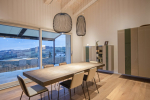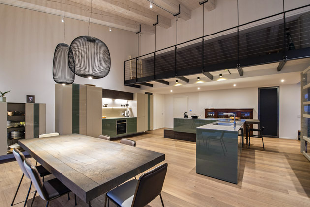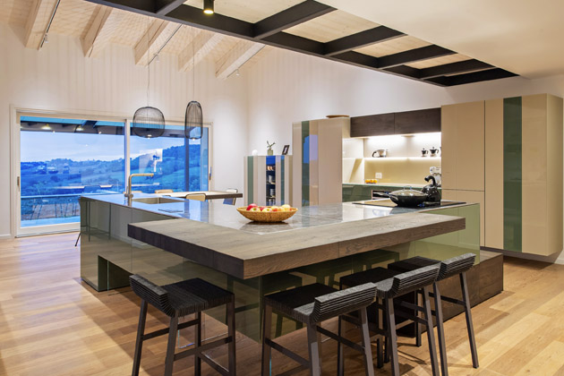 Základního zónového rozdělení prostoru Anna Paola Quargentan dosáhla prostřednictvím velmi vzdušné samostojné knihovny Air, když ji umístila na střed místnosti. Elegantně tak oddělila pohodlí obývacího pokoje od o poznání funkčnějšího charakteru kuchyně s jídelnou. S ohledem na životní styl majitelů přitom neváhala kuchyňské lince skutečně dopřát. Standardní kuchyňský modul zavěsila společně s úložnými skříněmi na stěnu. Tím vytvořila dostatek úložných míst na potraviny, kuchyňské náčiní a drobné i větší elektrospotřebiče, bez kterých se žádný nadšený kuchař neobejde. Hlavní pracovní zónu včetně mytí, přípravy a samotného vaření předsunula na masivní kuchyňský ostrůvek s netradiční konstrukcí – díky částečnému osazení skleněných podpor ostrůvek působí, že v některých místech levituje nad podlahou, a nepůsobí tak zbytečně hmotně. Jeho součástí je také stylový bar doplněný ladícími barovými židlemi. Na kuchyňskou část pak zcela přirozeně navazuje jídelna, které zcela dominuje ikonický jídelní stůl Air, jenž je stejně jako ostrůvek usazený na podporách z tvrzeného skla. Díky tomu ani on interiér zbytečně nezatěžuje a společně s minimalistickými židličkami se subtilní kovovou konstrukcí poskytuje díky umístění vedle francouzského okna zdejším obyvatelům mimořádné krásné výhledy do krajiny.