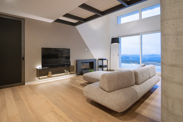 S nebývalou lehkostí si autorka interiéru pohrála také s obývací částí umístěnou „za knihovnou“. Jejím středobodem je neutrálně šedá pohovka Sand obdařená oblými organickými tvary, která se může pochlubit modulární konstrukcí. Skvělý doprovod jí pak poskytuje závěsná televizní skříňka z kouřového skla, jež dotváří intimní atmosféru svým LED osvětlením. Chybět ale pochopitelně nemohl ani nápadný krb, který se bude hodit, až i do Itálie dorazí ty dlouhé podzimní sychravé večery.