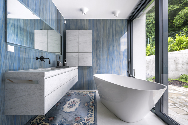 V modře zabarvené rodičovské koupelně na sebe upozorňují možnosti velkoformátových dlaždic, s nimiž se tu podařilo bezespárové obložení stěn od podlahy až ke stropu. Tato pokládka nechala vyniknout i výrazné kresbě imitace onyxu. Dekor kamene je použitý také na nábytku, pro který zvolili návrháři světle šedý odstín. Modrošedou kombinaci doplňují tmavé doplňky, černé armatury a okenní rámy, které celku dodávají dynamičtější podobu. Dostatek úložného prostoru, který umožňuje, aby celkový vzhled koupelny nerušily hygienické pomůcky, nabízí kromě široké umyvadlové skříňky s prostornými zásuvkami i závěsná skříňka se čtyřmi oddělenými boxy. Důležitým prvkem této koupelny je prosklená část s dveřmi, které poskytují hodně světla i vstup na zahradu. Dostatečný prostor tu umožnil instalaci volně stojící vany s černou podlahovou baterií. Kromě dobrého nasvětlení prostor koupelny opticky zvětšuje také široké zrcadlo nad umyvadlem.