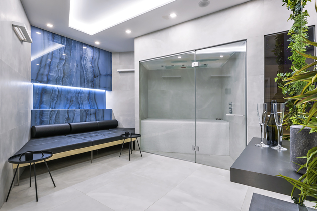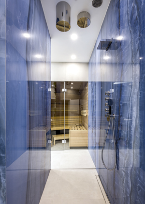 Prostor přízemní části domu umožnil, aby si tu majitelé mohli dopřát i relaxační zónu. Také zde jsou obklady s dekorem onyxu, tentokrát však v tmavším a výraznějším odstínu modré, kterou na podlaze a části stěn utlumují světle šedé dlaždice s dekorem betonu a také nástěnná dekorace se zelenými rostlinami. |Je tu finská bio sauna, ve které je možné podle individuálních potřeb snižovat teplotu a zvyšovat vlhkost, a oddělený box s lehátkem, nad kterým jsou umístěny masážní sprchy. Za příčkou s umyvadlem je volně přístupný sprchový kout, který je vybaven systémem sprch s režimy tropického deště a vodopádu. K odpočinku po sauně slouží prostorné lehátko s odkládacími stolky. Součástí wellness prostoru je i oddělená toaleta.