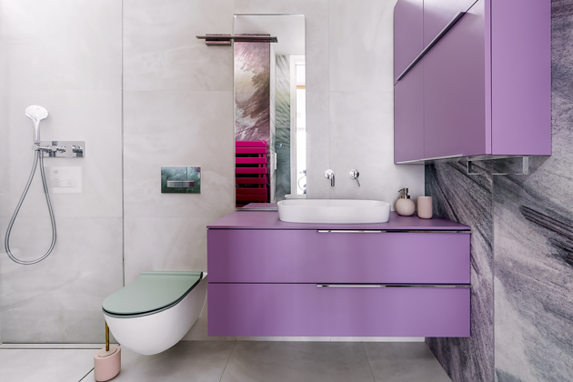 Foto: Lukáš HausenblasDětská koupelna je barevně výraznější. Prim tu hraje na nábytku použitá světle fialová barva, která se částečně objevuje i na vícebarevných tapetách. Zbývající stěny a podlaha jsou světle šedé. „Dětské“ barvy tu zastupuje červený radiátor či mentolové sedátko toalety, což jsou předměty, které bude možné časem bez náročných zásahů vyměnit.