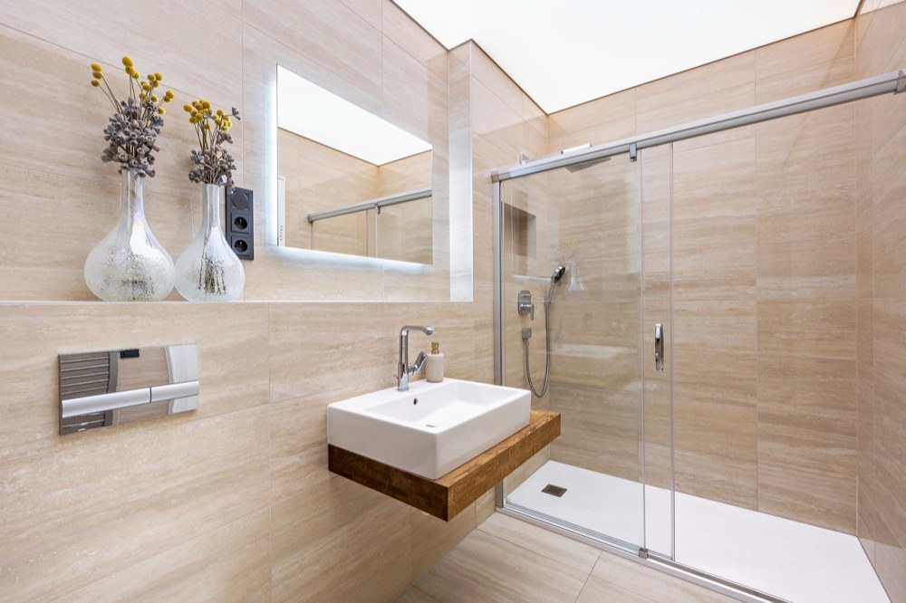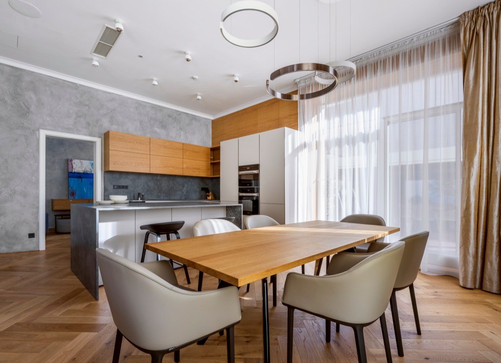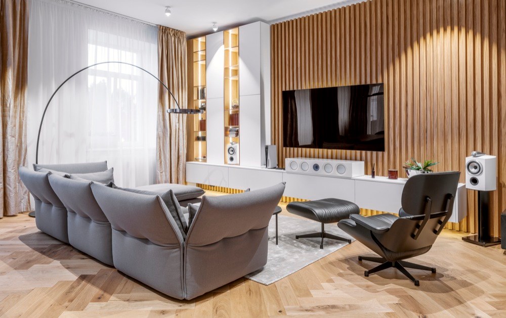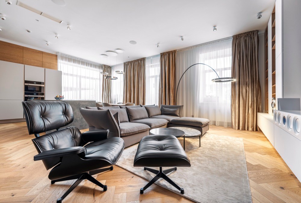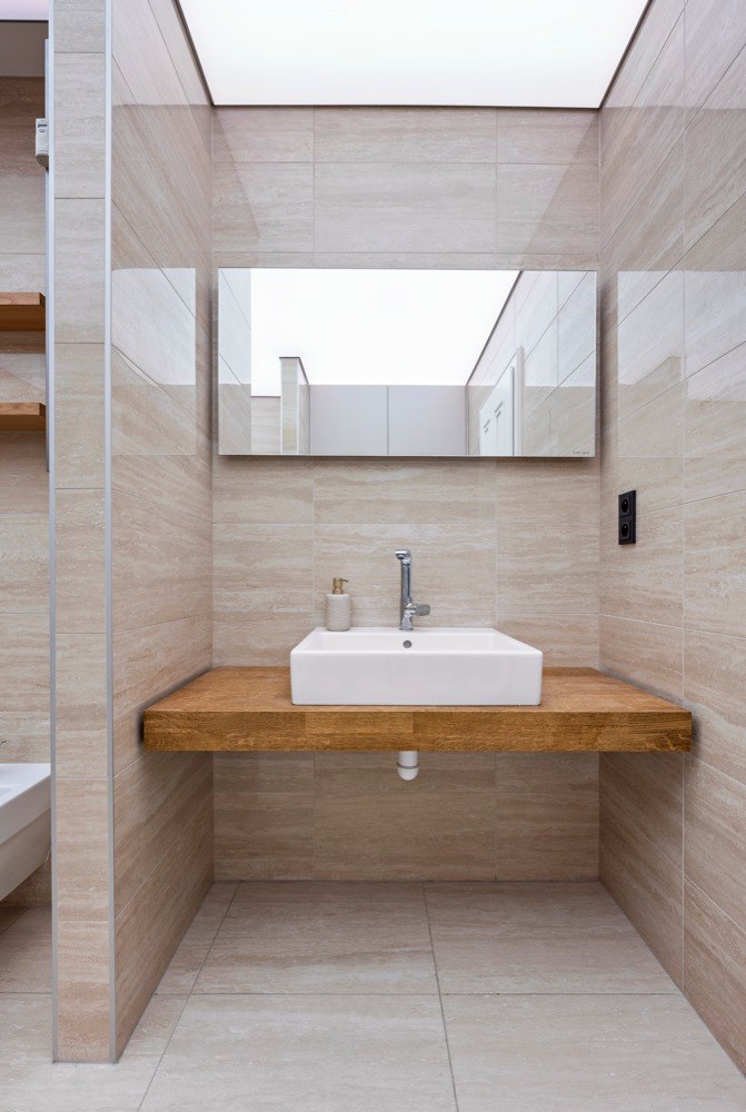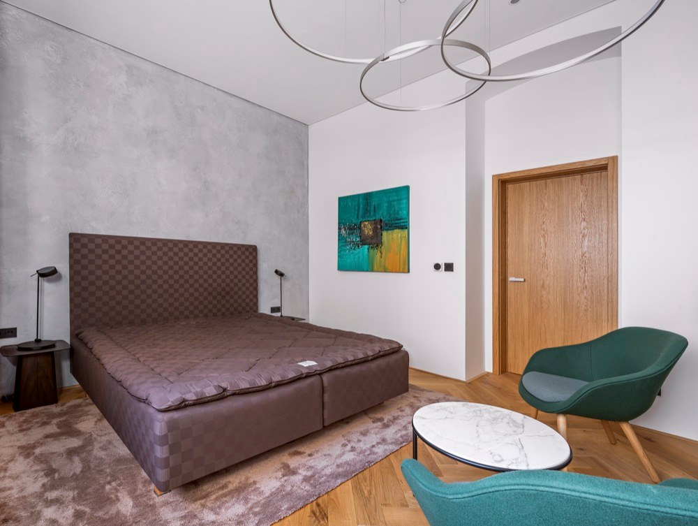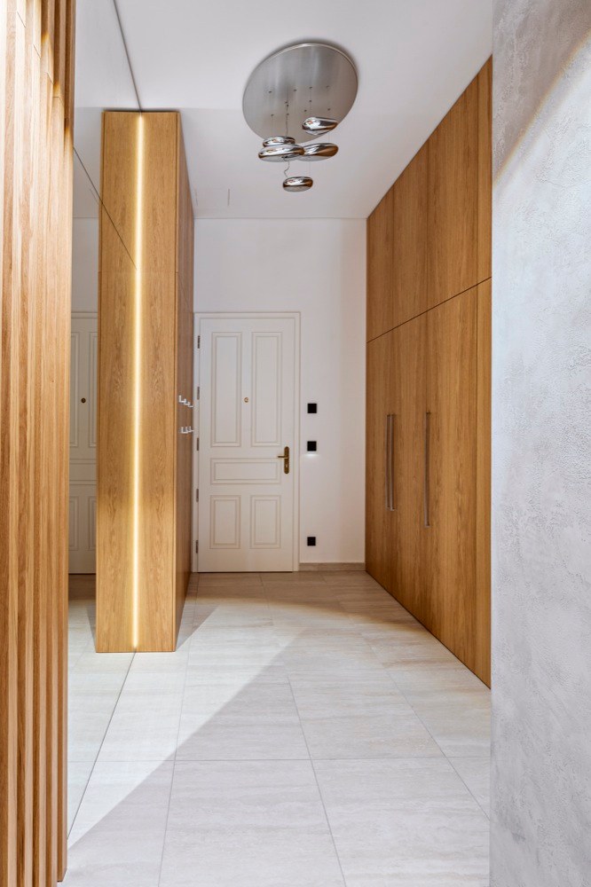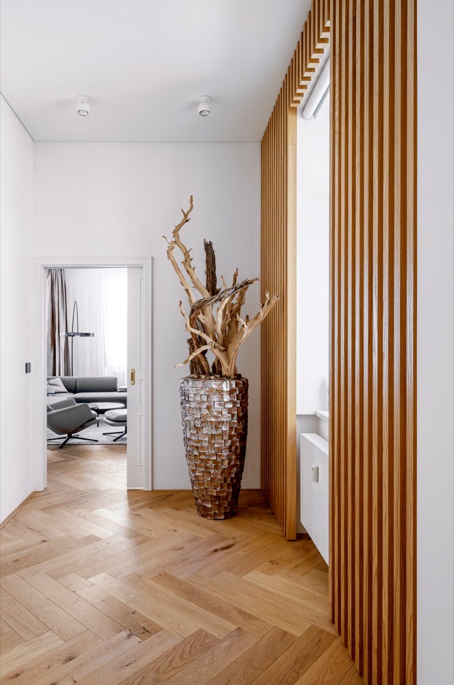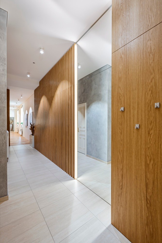 Byt, který může do budoucna nabídnout příjemné zázemí i rodině s dvěma dětmi, čítá 185 m2 a zahrnuje i mimořádně prostornou terasu o 80 m2 s výhledem do zeleně. Majitelem je mladý člověk, který se pohybuje v oblasti IT technologií, proto architekt nejprve zvažoval návrh rozevlátějšího až studentského stylu. „Po diskusi jsme se však shodli na nadčasovém pojetí interiéru, který odrazí stálost a hodnotu bytu v čase a v budově, která tento styl sama předurčuje. Za to má majitel bytu můj velký respekt. Není z těch, kteří se nechají strhnout módními výstřelky, podbízivou zdobností či barevností,“ chválí investora architekt. „Snažili jsme se ale interiér příliš nezatěžovat zodpovědností k hodnotné architektuře domu, ale odlehčit ho. Vytvořit ho vzdušný a světlý s použitím kvalitních materiálů, jako je dřevo, kámen, sklo apod.,“ přibližuje svůj záměr Jiří Vlček. Aplikované materiály doplnili unidekorem, ne v laku, jak by se dalo předpokládat, ale použili technologicky inovativní nanopovrchy, které oplývají výbornými vlastnostmi praktickými, perfektně vypadají, ale i skvěle zapadají do zvolených kombinací materiálů a barev. Developer dodal byt ve stavu holobytu s hotovými koupelnami, ale bez nábytku. Dispozice studio VP architekti upravovali jen kosmeticky. „Ponechali jsme i osazené prolisované fabiony u stropu. Se stropy vysokými 3,5 m jsme se rozhodli ponechat je a detaily i styl tomu přizpůsobit,“ vysvětluje architekt. Kompletně ale bylo nutné předělat elektroinstalaci, zaváděli tzv. chytrou domácnost. Nábytek byl navržen a vyroben na míru včetně kuchyně, která je vybavena špičkovými spotřebiči značky Miele, jež si majitel přímo vyžádal. V koupelnách použili pnuté stropy, tzv. Vectu, která poskytuje rozptýlené světlo. „Pokud nesvítí, je strop koupelny bez viditelných světel. Vypadá jako zcela netknutá, čistá plocha. Při rozsvícení může měnit barvy. Například užitím studeného světla je možné navozovat dojem světlíku ve stropě nebo naopak použitím teplého při ztlumení navozovat příjemné noční ambientní osvětlení. Tím, že lze osvětlení takto nastavovat, je možné přizpůsobit domácnost správným světelným podmínkám v průběhu dne, a připravit tak organismus přirozeně na spánek,“ vysvětluje architekt a pokračuje: „Lví podíl na dodávkách kvalitního vybavení interiéru má společnost Lino design.“