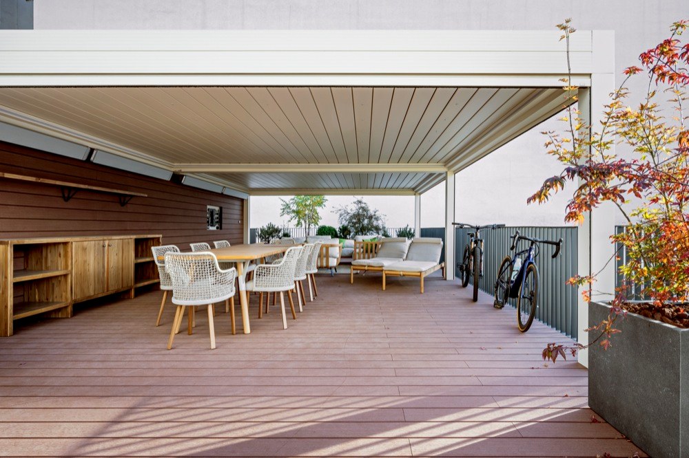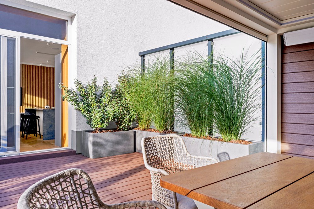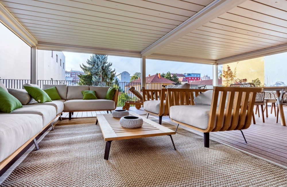 Samostatnou kapitolou prací byla velká terasa, kde bylo třeba vyřešit zeleň, otázku závlahy i dodávku umělého dřeva na podlahy. O to se postarala firma Floveristas. Původní dřevěná podlaha nebyla v kondici pro komfortní užívání a musela být demontována. Samozřejmě bylo třeba věnovat pozornost i osvětlení, vytápění a vhodnému venkovnímu nábytku. Interiér byl nakonec pro majitele připraven jako realizace na klíč, kompletně vybavený až do posledního detailu.