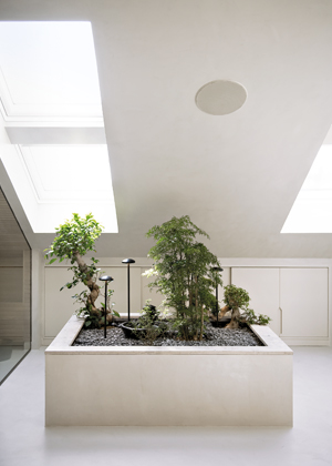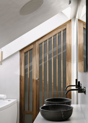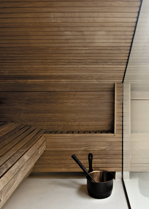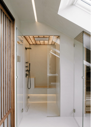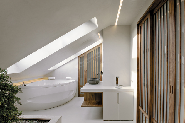 Majitelé podkrovního bytu ve stockholmské čtvrti Vasastaden toužili po prostoru, kde by ze sebe mohli každý den setřást starosti a stres. Spojili se s mladou architektkou Marií-Thérèse Kazantzidou, která dostala geniální nápad – odstranit snížený strop v podkrovní části a otevřít místnost až po hřeben střechy. Vznikl tak velkorysý, poměrně vzdušný prostor, kam se kromě sprchového koutu s funkcí parní lázně vešla i prostorná vana pro dva a pohodlná sauna. Architektka do středu koupelny postavila vyvýšený záhon s malou zenovou zahrádkou – výrazný vizuální prvek s meditativním nábojem, na který je krásně vidět z vany, prosklené sauny i sprchového koutu. Dalším tradičním prvkem japonské architektury, který sem přenesla, jsou tradiční posuvné dveře šódži, kterými lze celý prostor uzavřít nebo naopak propojit s navazující relaxační místností s krbem, čtecím křeslem a domácím kinem.